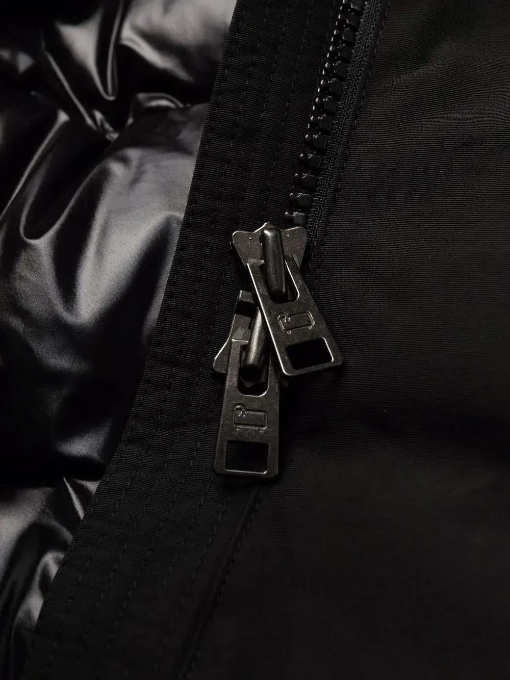 Дутый материал, классический капюшон, потайная пуговичная застежка спереди, передние карманы с клапаном и длинные рукава. Цвет: черный.