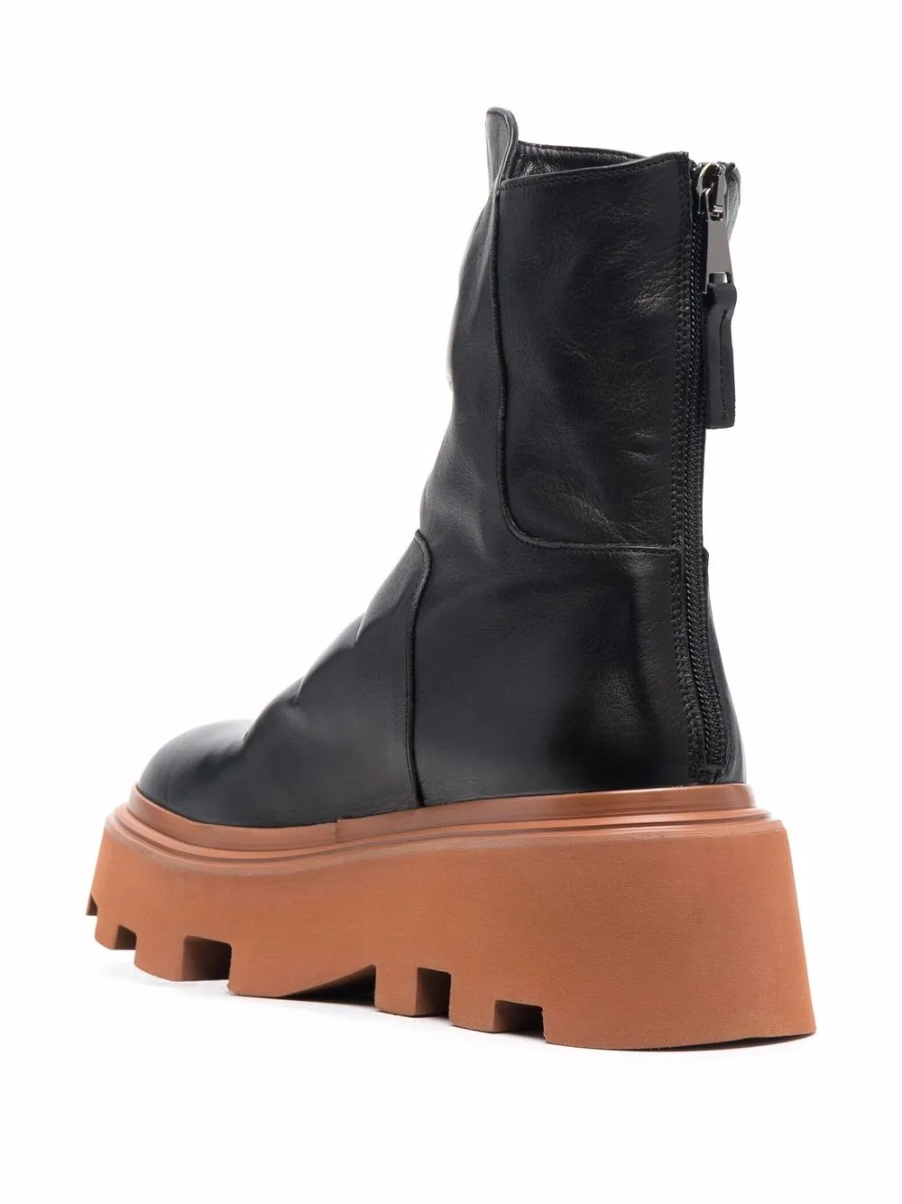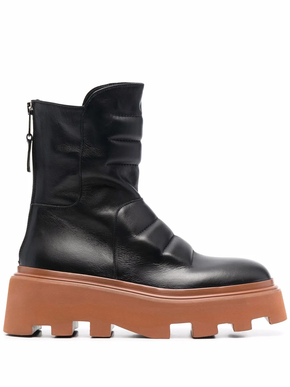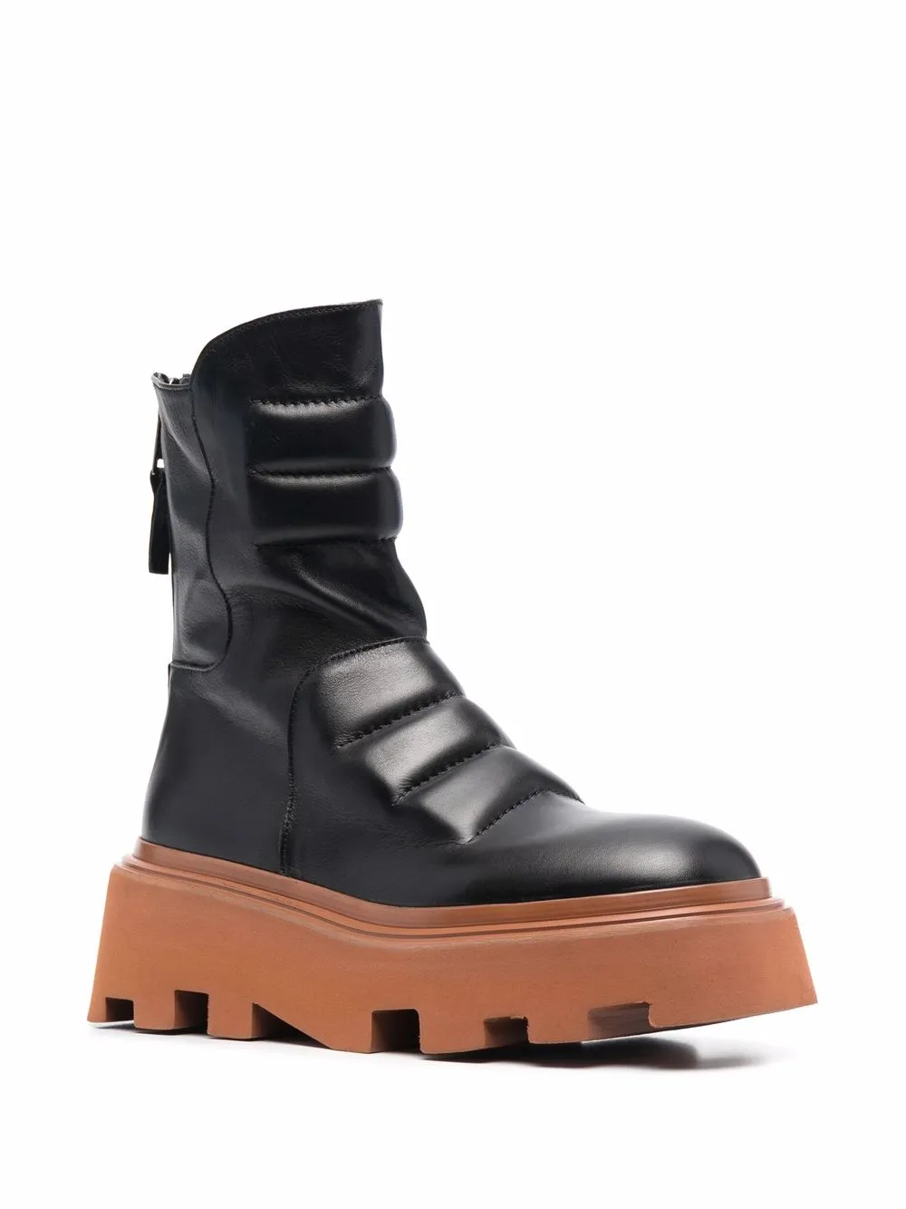 Закругленный носок, дутый материал, застежка на молнии сзади и массивная резиновая подошва.
