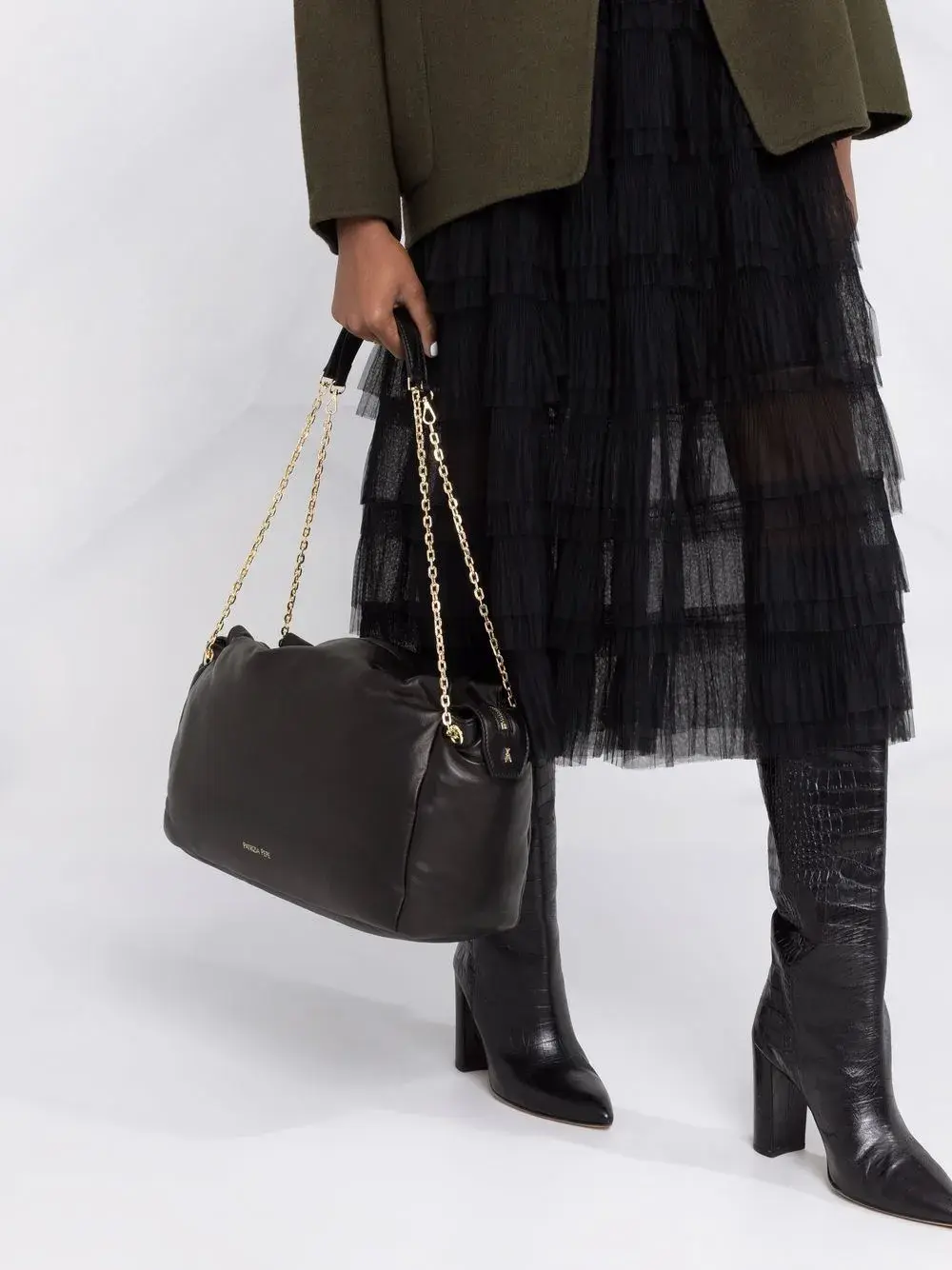 Многослойный дизайн, верхний слой из тюля, завышенная талия и длина миди.