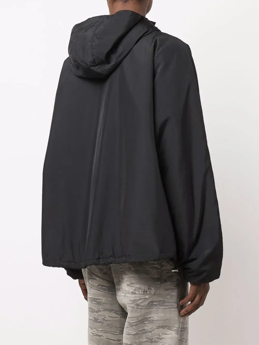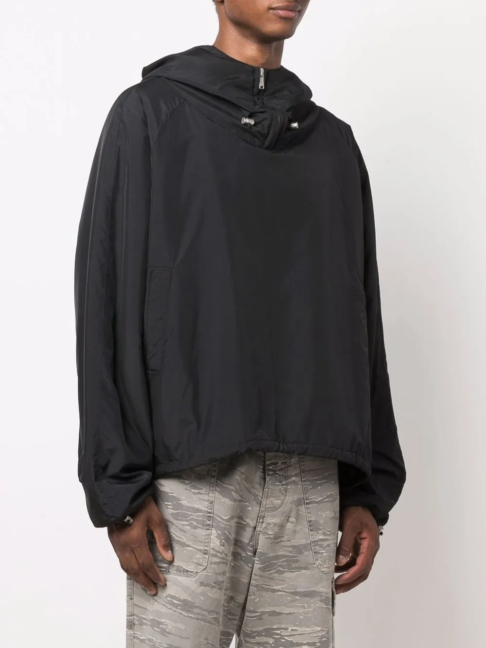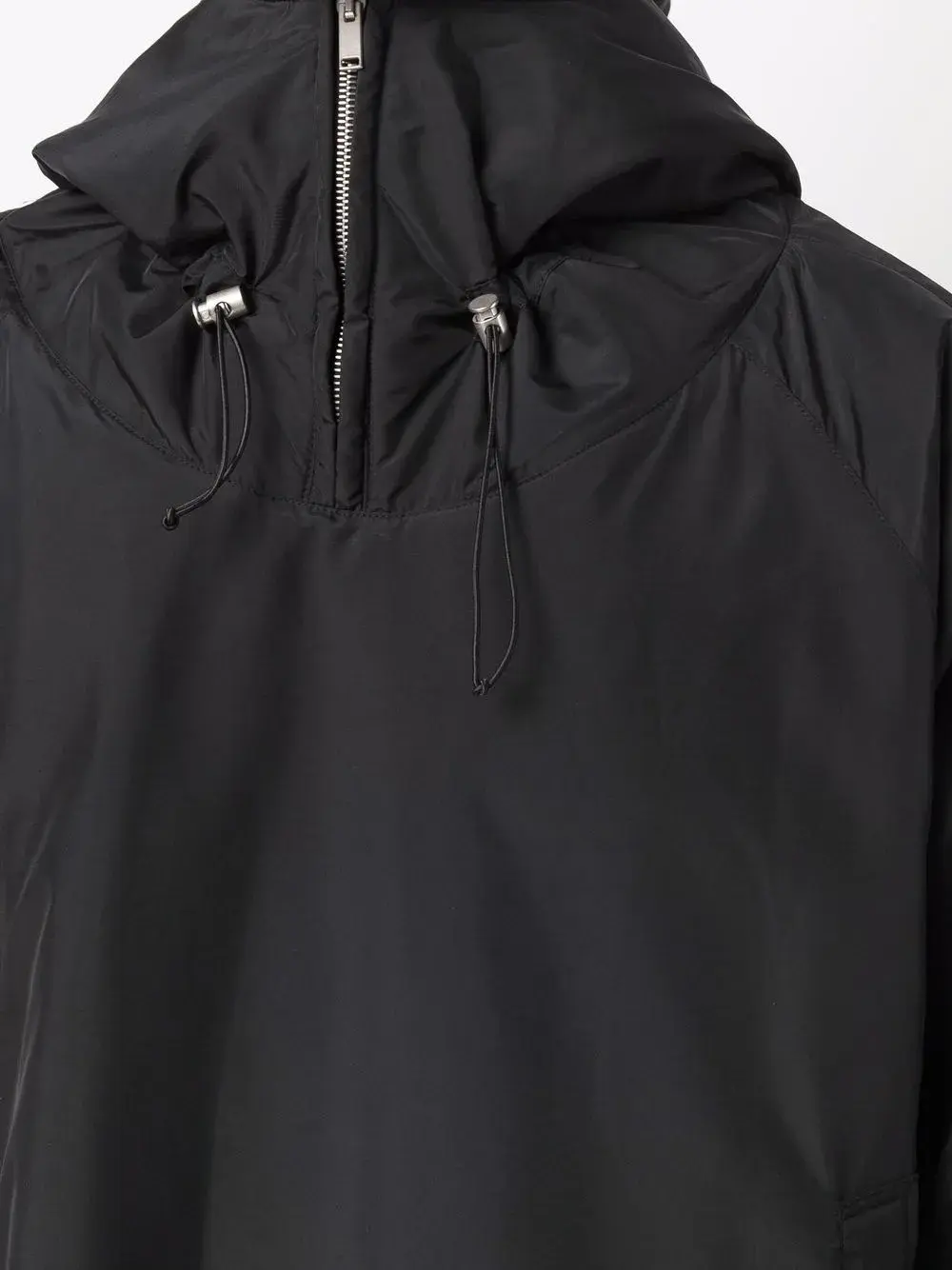 Высокий воротник, короткая застежка на молнии спереди, классический капюшон, длинные рукава, манжеты с кулиской и А-образный силуэт. Цвет: черный.
