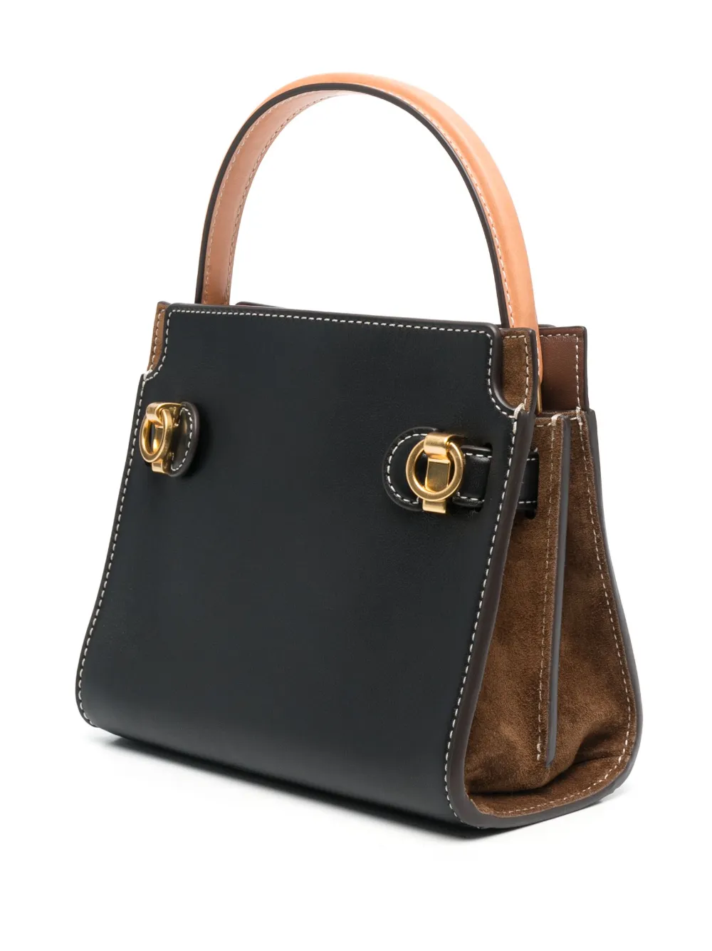 Сочетание двух оттенков, зернистая текстура, замшевые вставки, золотистая фурнитура, застежка на зажиме, закругленная верхняя ручка, съемный регулируемый ремень на плечо, несколько отделений и внутренний карман на молнии.