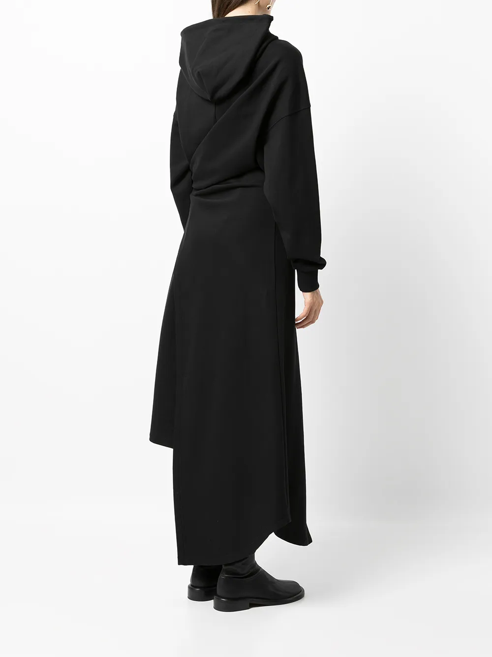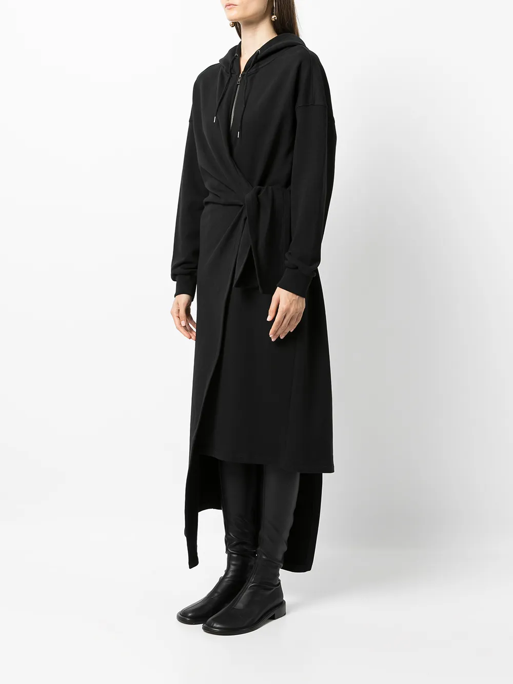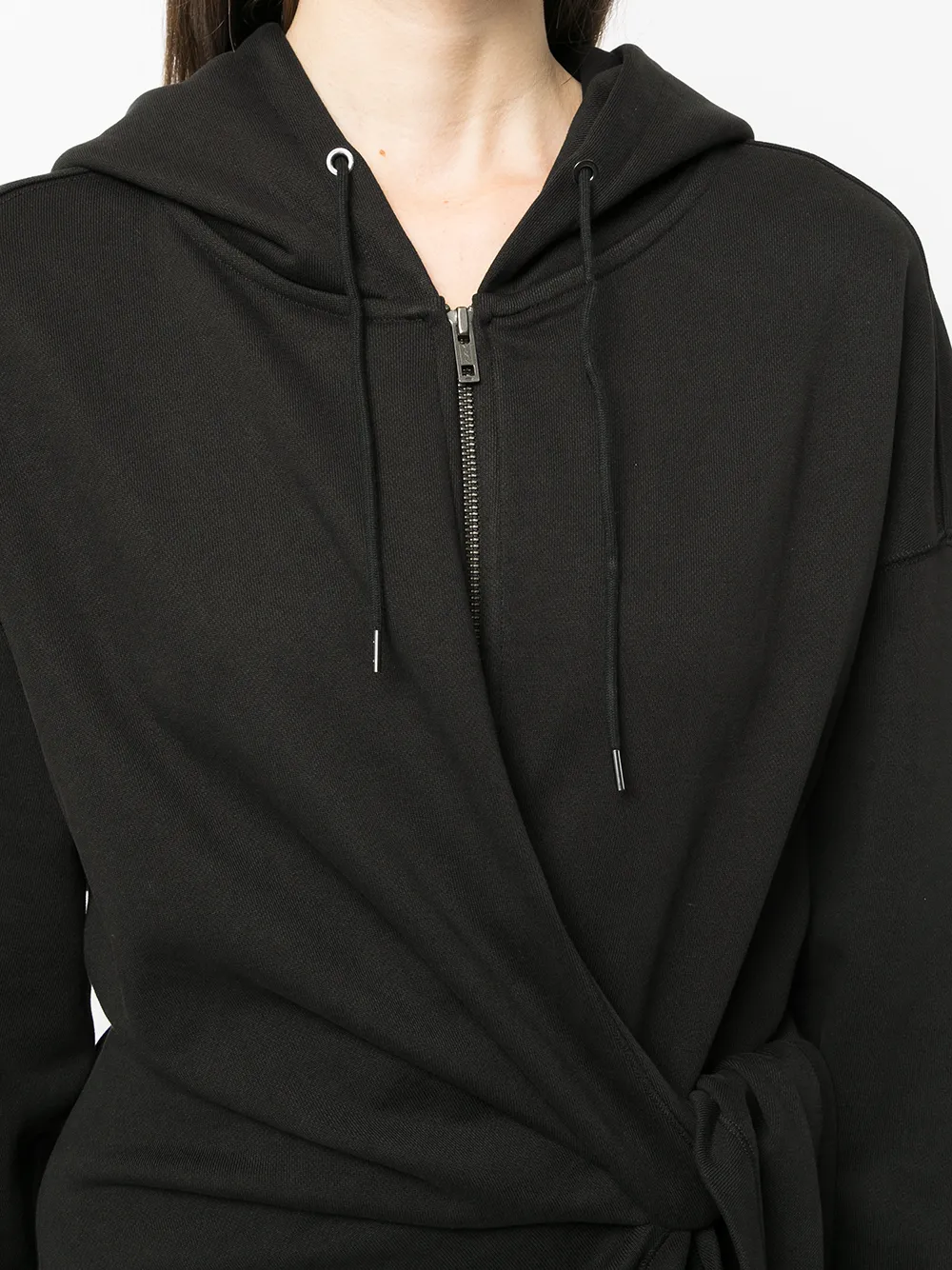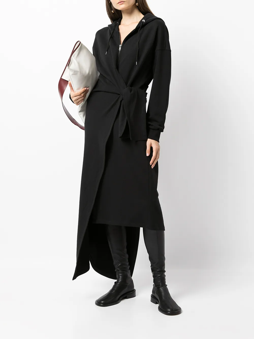 Декор в виде узла, застежка на молнии спереди, длинные рукава, рукава с узкими манжетами, затягивающийся на шнурок капюшон, асимметричный подол и длина миди.