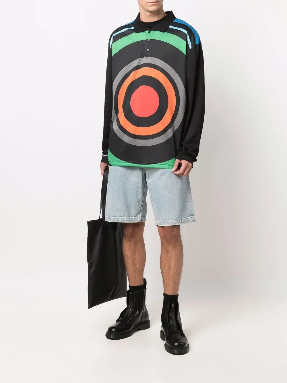 Разноцветный принт, воротник поло, планка на пуговицах спереди, длинные рукава и прямой подол.