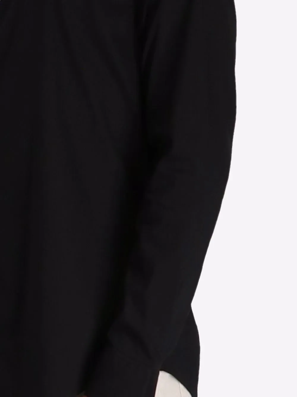Классический воротник, застежка на пуговицах спереди, длинные рукава и закругленный подол.