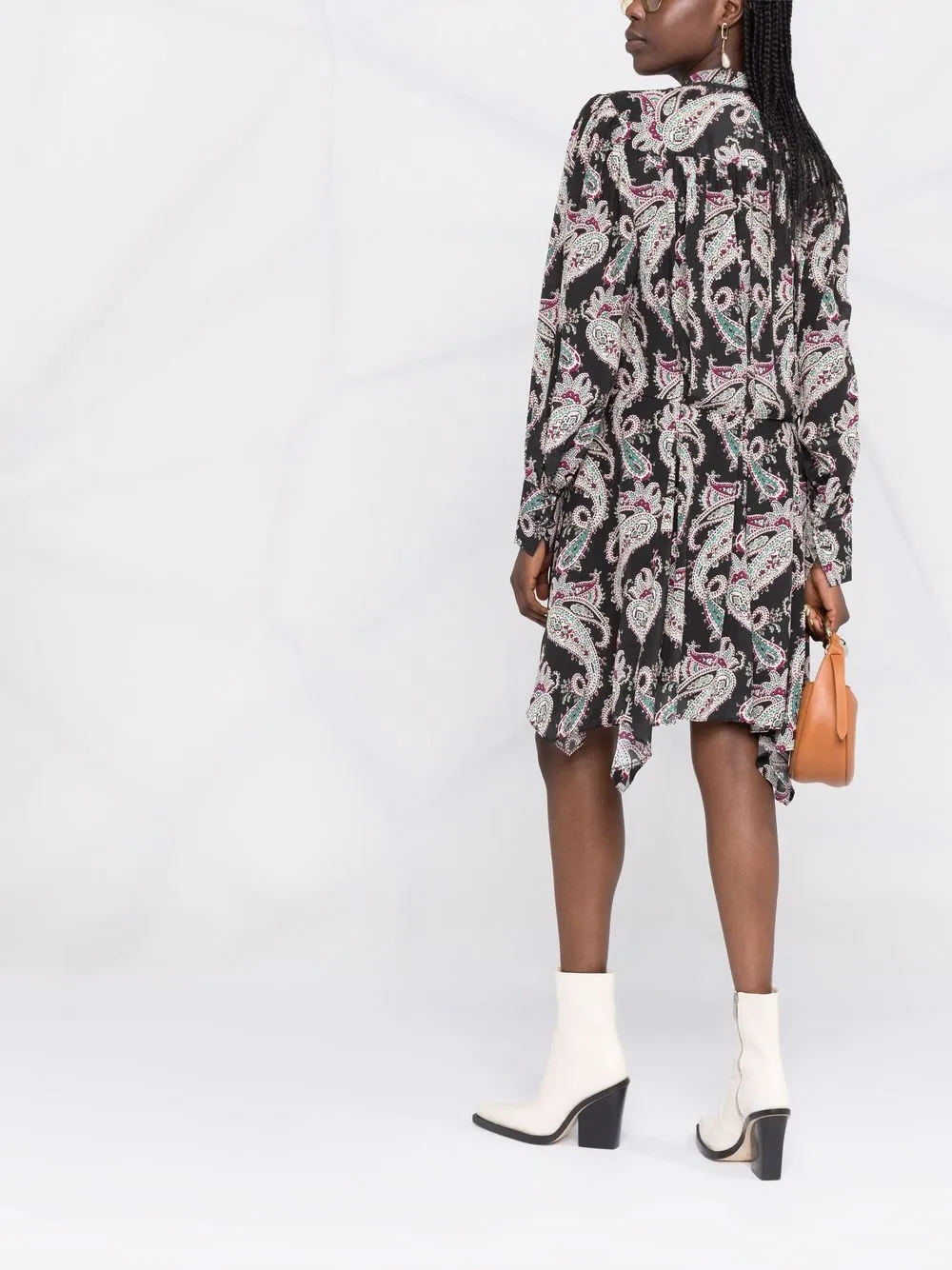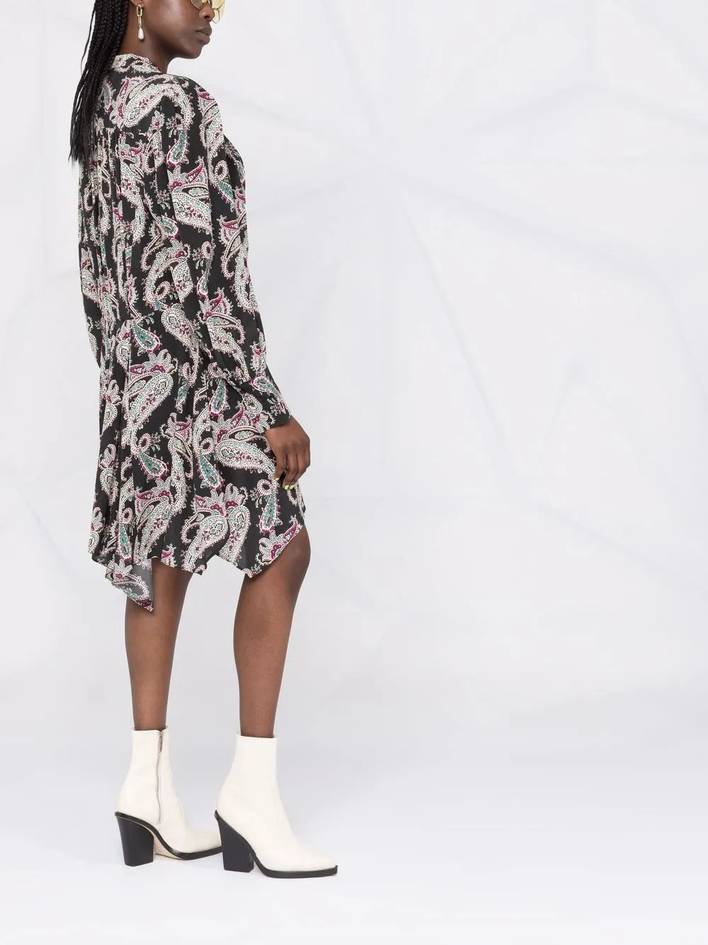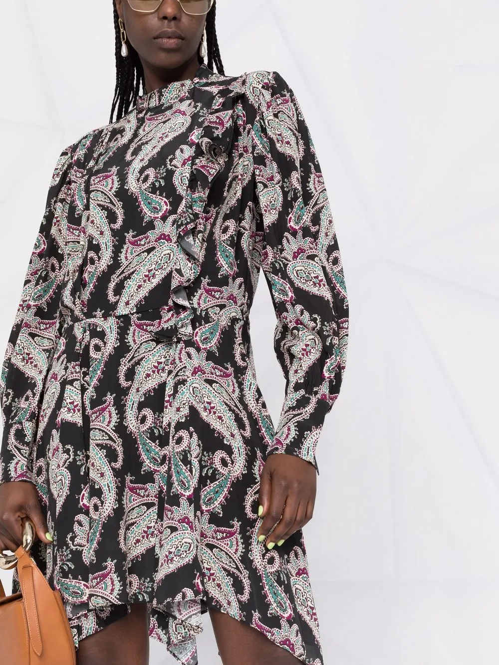 Принт пейсли, вставки с оборками, асимметричный подол, высокий воротник и длинные рукава. Цвет: разноцветный.