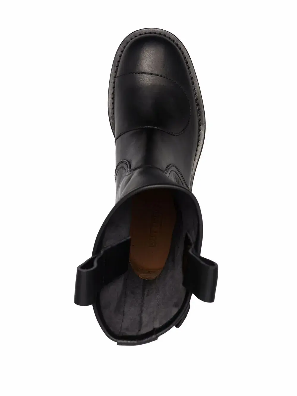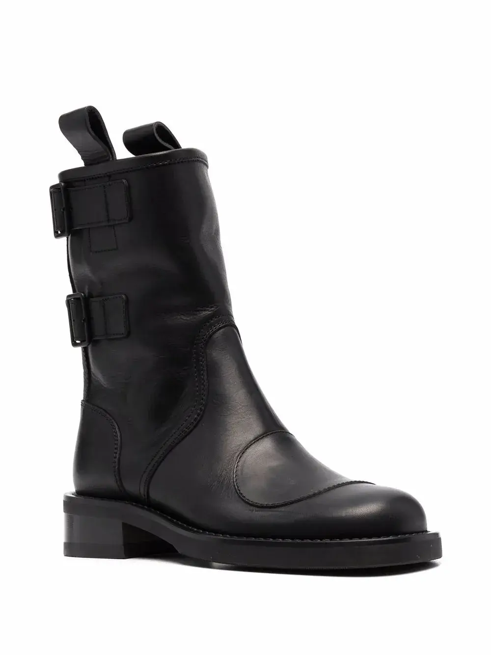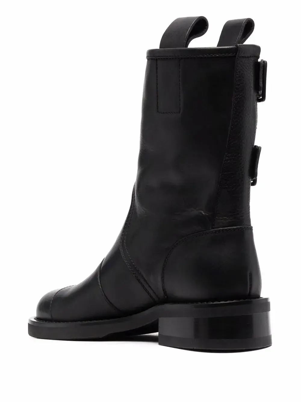 Закругленный носок, декоративная пряжка, длина до середины икры, плоская резиновая подошва и низкий блочный каблук. Цвет: черный.