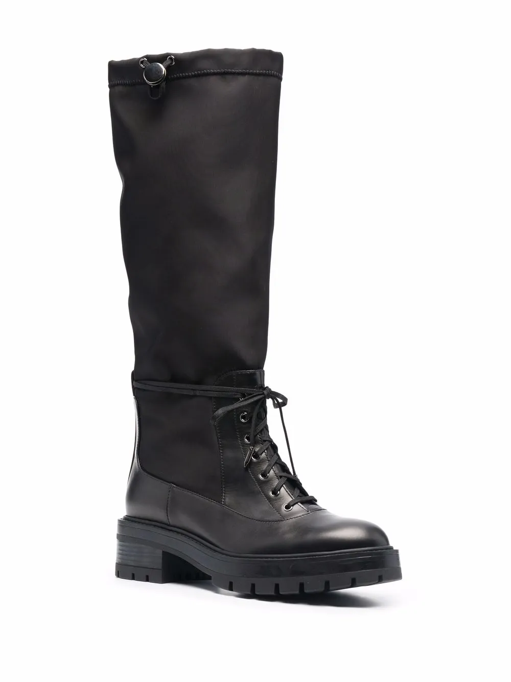 Длина по колено, застежка на шнурке, шнуровка спереди, закругленный носок и низкий ребристый каблук. Цвет: черный.