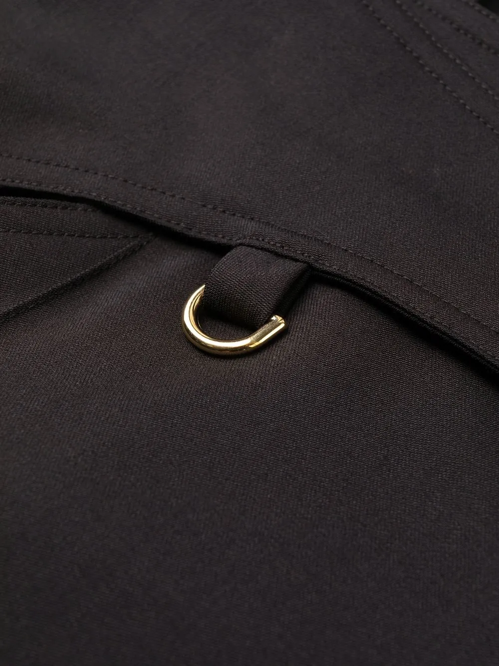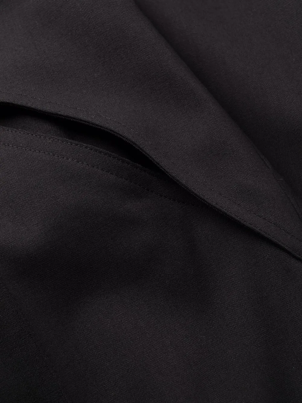 Средняя посадка, плиссировка, два передних кармана с листочкой, D-образная фурнитура, потайная застежка на молнии сбоку и прямой крой. Цвет: черный.