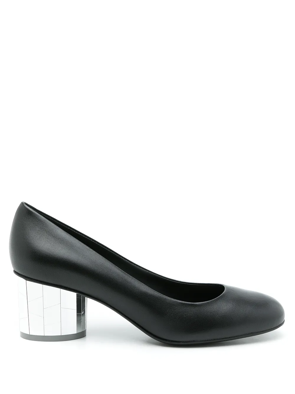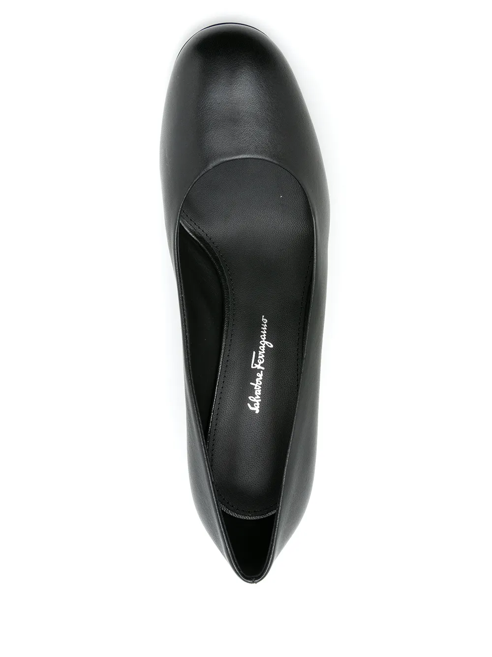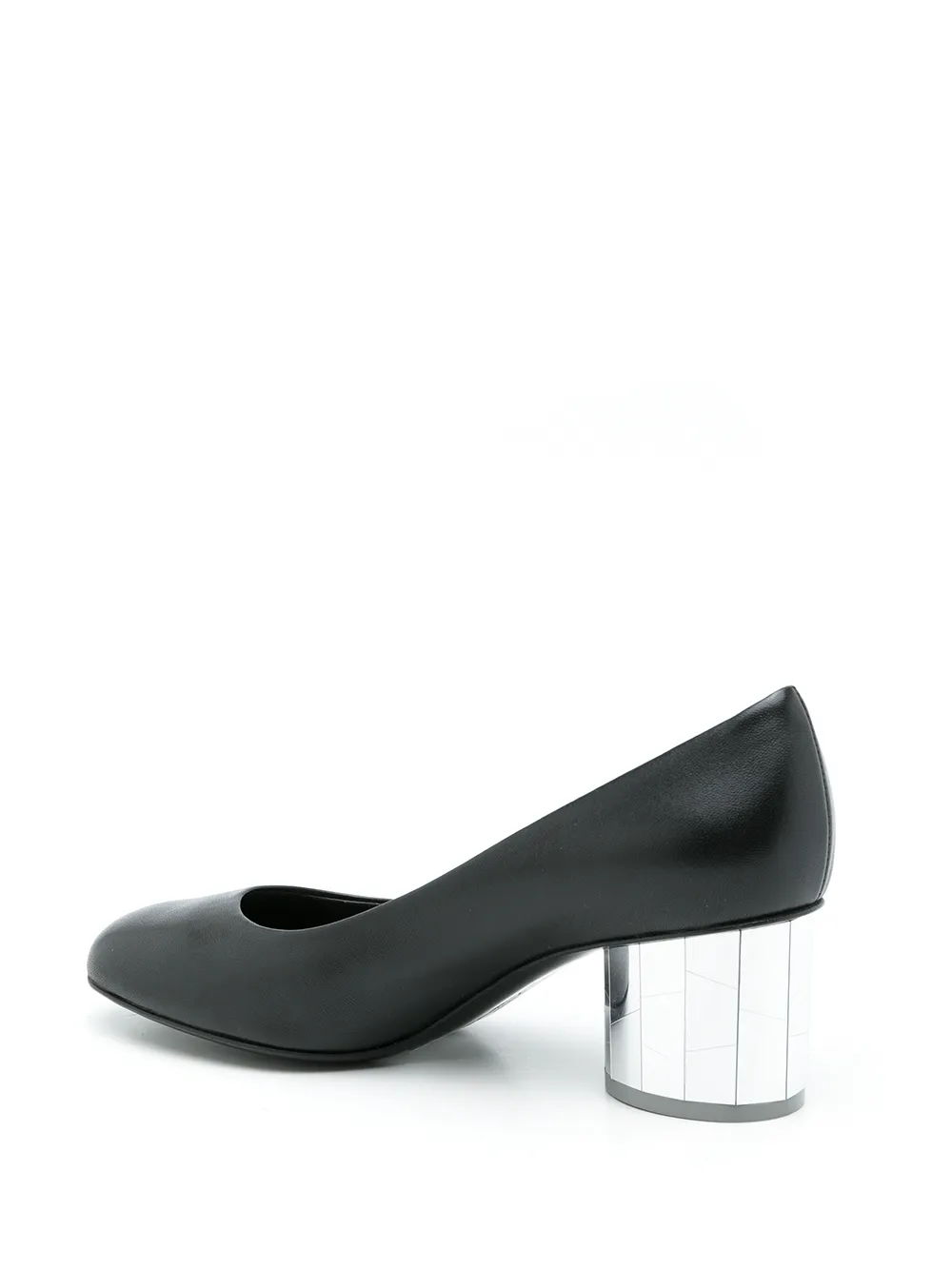 Модель без застежки, закругленный носок, кожаная стелька с логотипом и низкий блочный каблук. Цвет: черный.