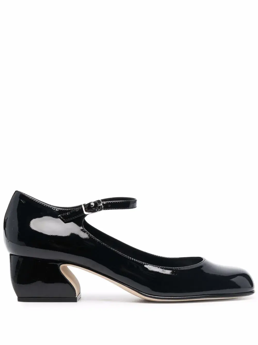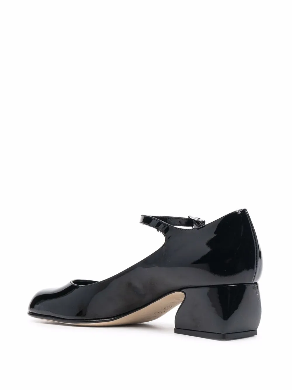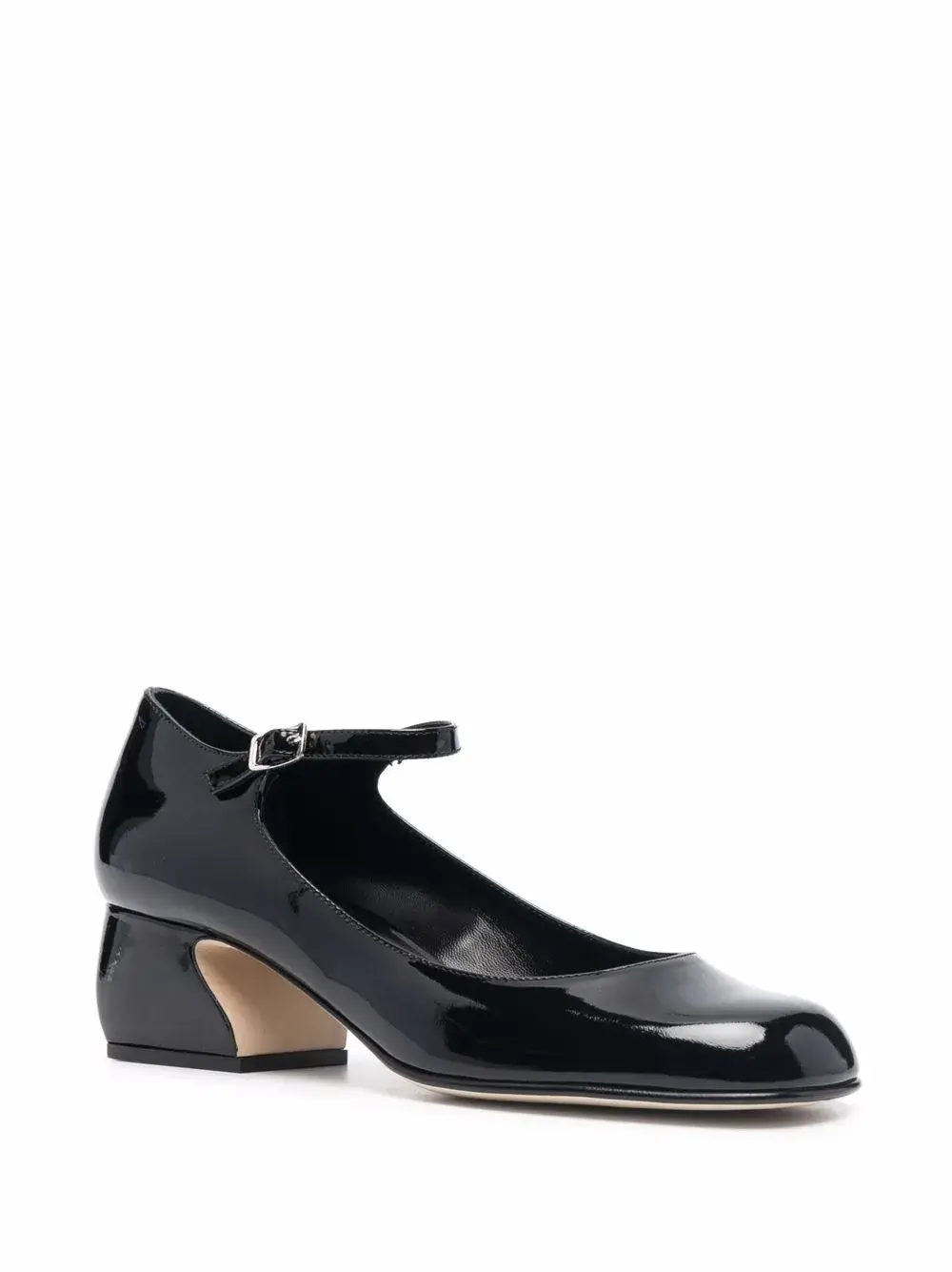 Ремешок на щиколотке с пряжкой, глянцевая фактура, закругленный носок, кожаная стелька с логотипом и низкий скульптурный каблук. Цвет: черный.