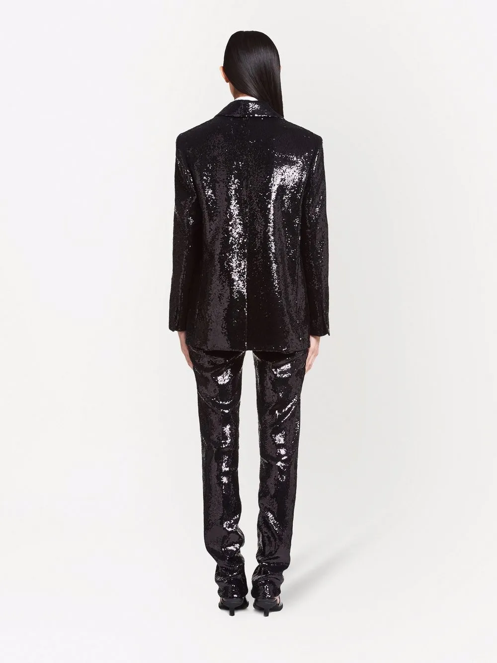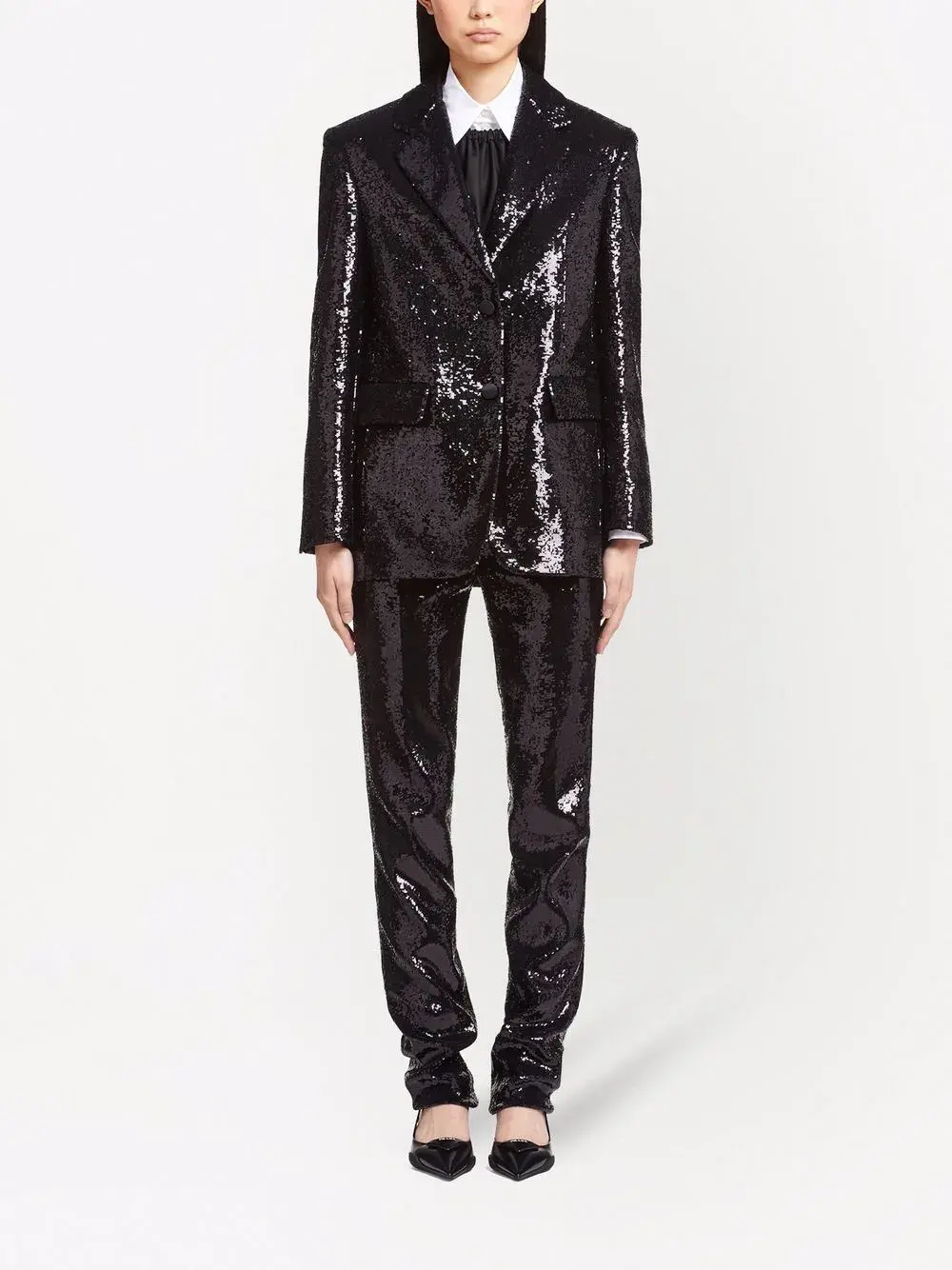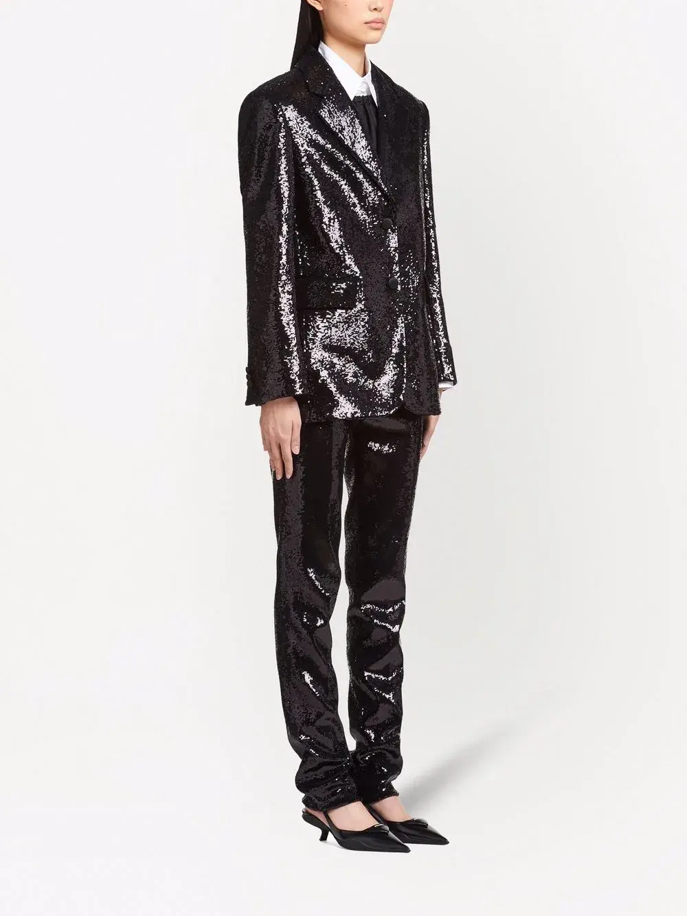 Украшение из пайеток, зазубренные лацканы, застежка на пуговицах спереди, два кармана с клапанами по бокам и длинные рукава. Цвет: черный.