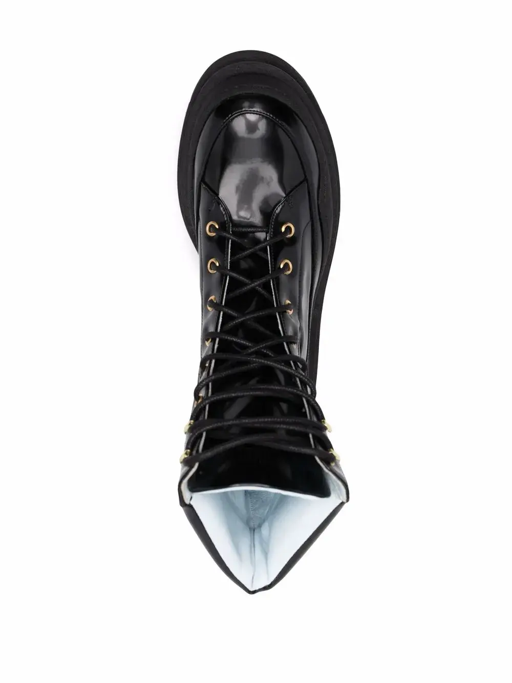 Лакированное покрытие, золотистый металлический логотип, миндалевидный носок, длина по щиколотку, стелька с логотипом, низкий ребристый каблук и ребристая резиновая подошва. Цвет: черный.