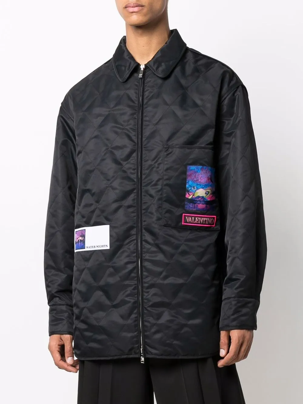 Коллекция Valentino Ready To Wear, принт с эффектом печати, стеганая отделка, нагрудный накладной карман, классический воротник, застежка на молнии спереди, длинные рукава и закругленный подол. Цвет: черный.
