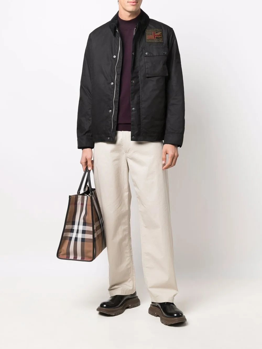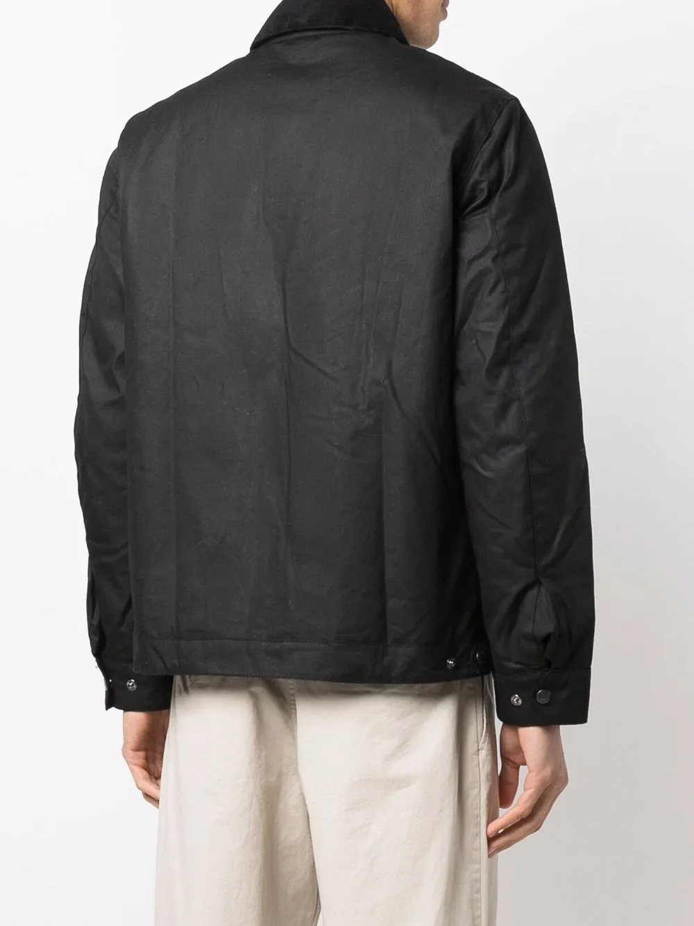 Вощеный материал, высокий воротник, застежка на пуговицах спереди, длинные рукава, нагрудный карман с клапаном, прямой подол и цельная подкладка.