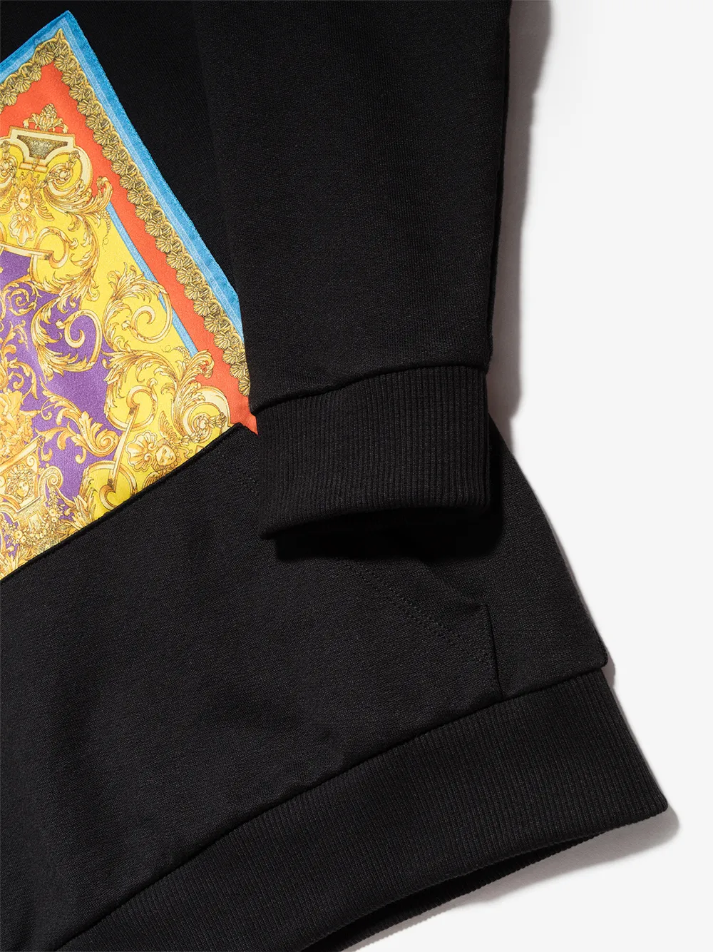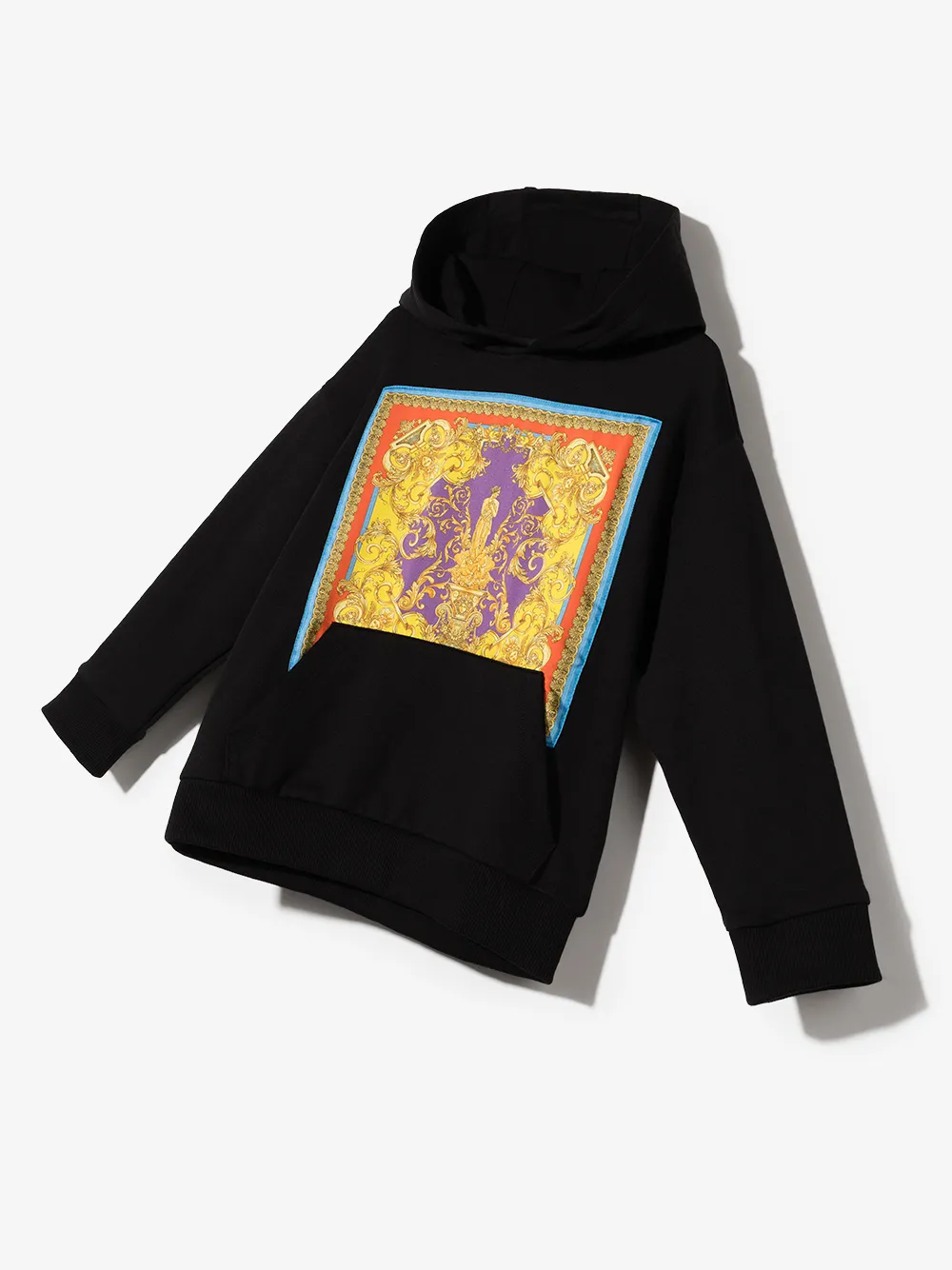 Черный, разноцветный, принт в стиле барокко, классический капюшон, длинные рукава и карман-муфта.