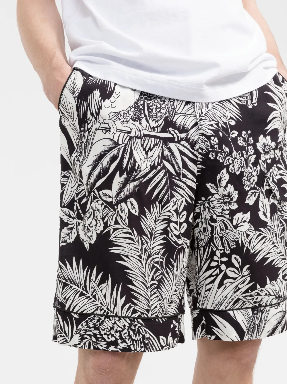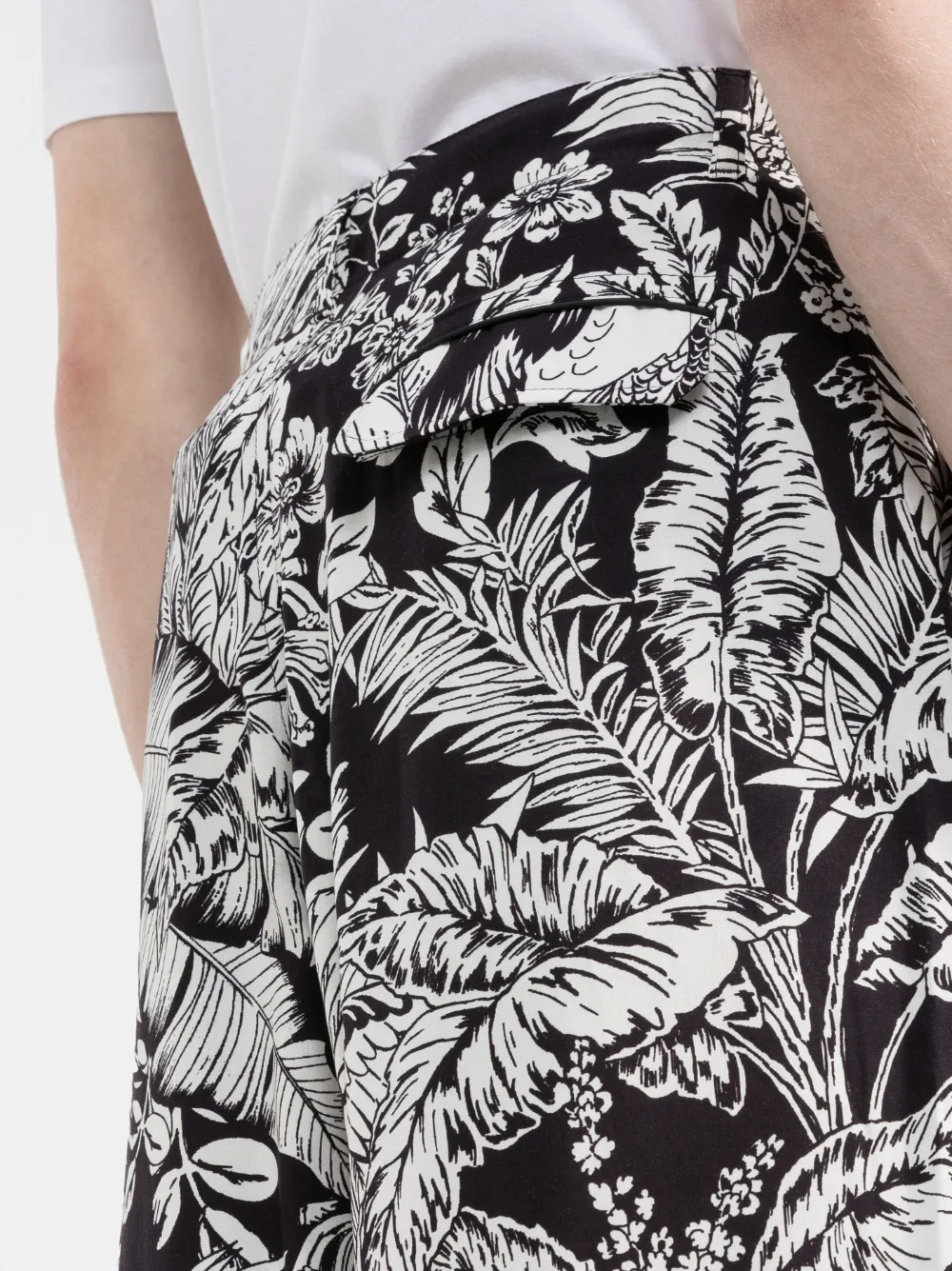 Сплошной графичный принт, два вшитых кармана по бокам, два кармана с клапанами по бокам, прямой крой и длина по колено.