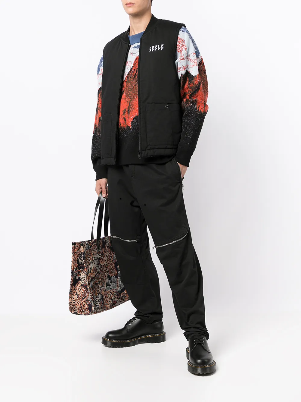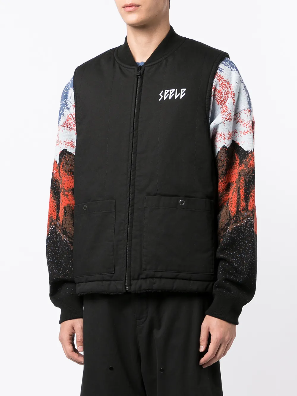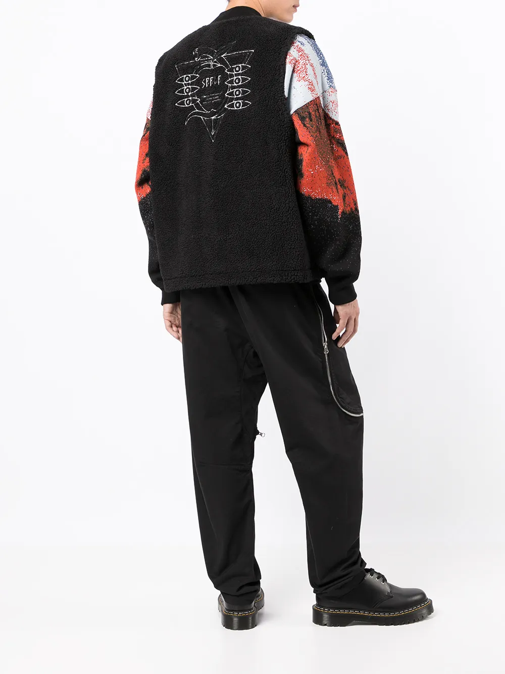 Двухсторонний дизайн, материал c флисовой текстурой, принт с надписью спереди, принт с надписью сзади, высокий воротник, застежка на молнии спереди, без рукавов, два накладных кармана спереди, накладной карман сзади и прямой подол. Цвет: черный.