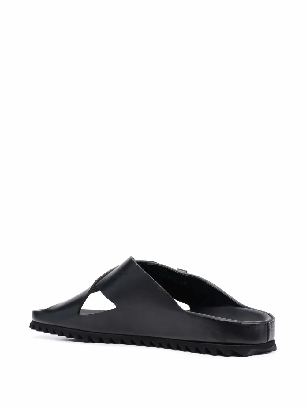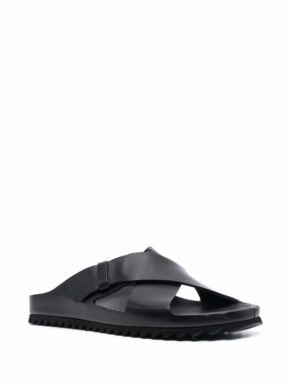 Модель без застежки, перекрестные ремешки, закругленный носок, стелька с логотипом и плоская резиновая подошва. Цвет: черный.