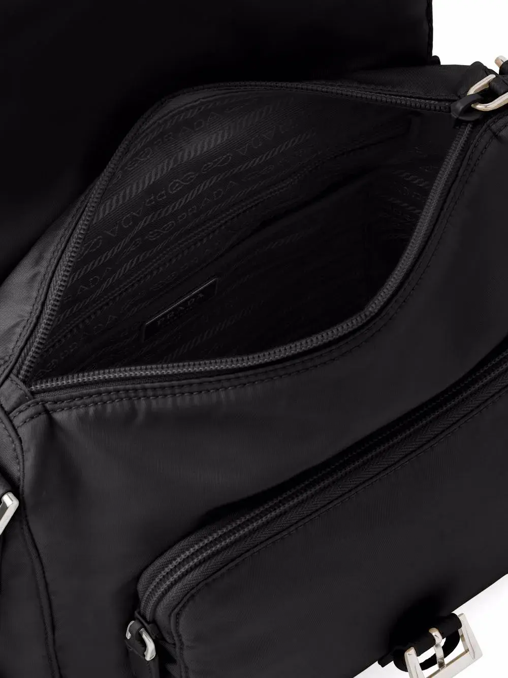 ECONYL, регулируемый ремень на плечо, серебристая фурнитура, треугольный эмалированный логотип, карман на молнии спереди, накладной карман на молнии спереди, застежка с клапаном спереди, застежка на пряжке, застежка на молнии сверху, подкладка с логотипами, внутренний карман на молнии и металлический логотип внутри. Цвет: черный.