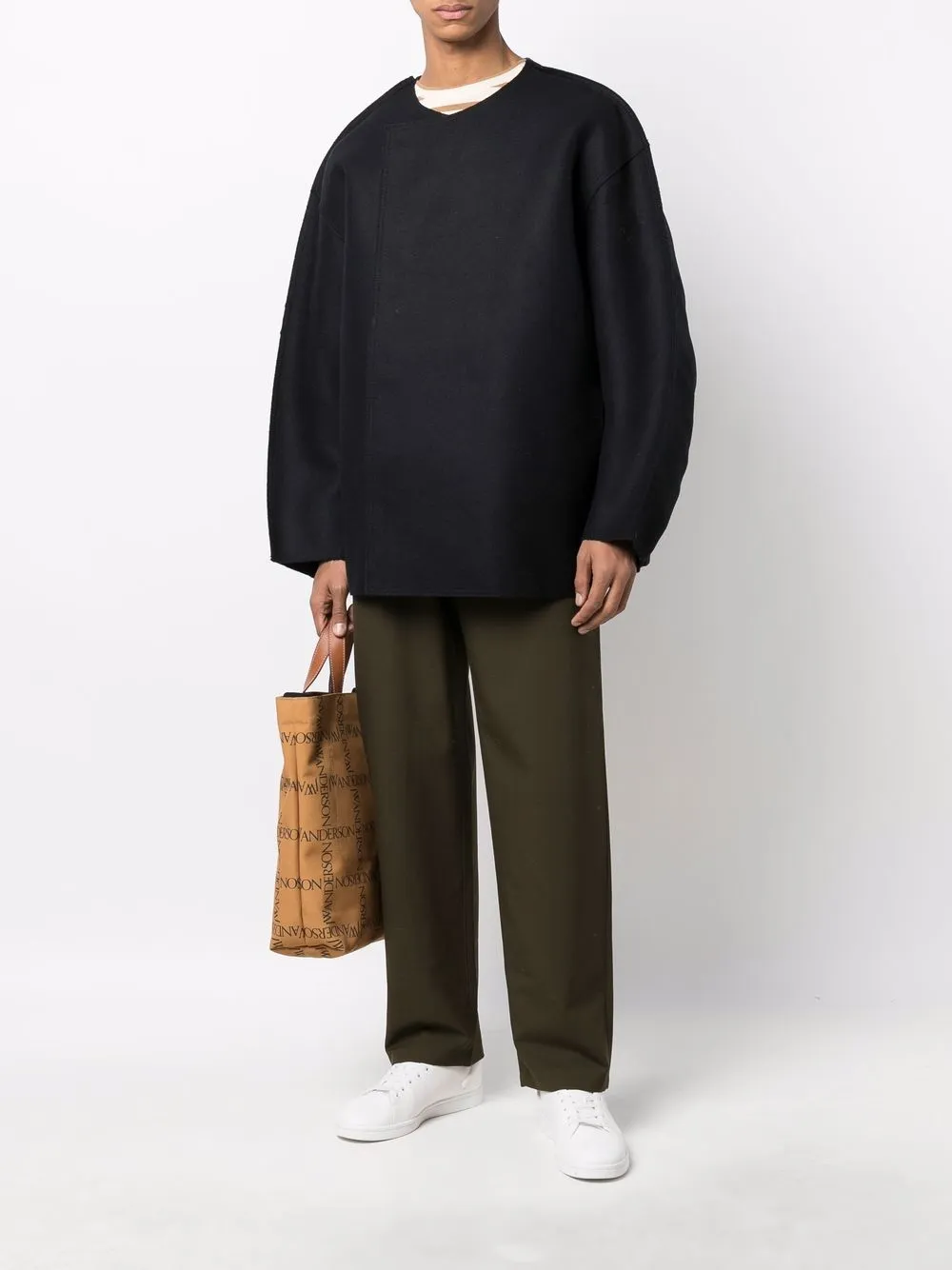 Асимметричная форма, застежка на кнопках спереди, круглый вырез, длинные рукава, декоративные швы и широкая модель.