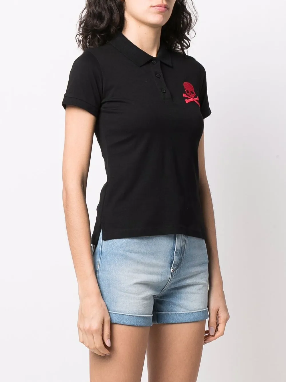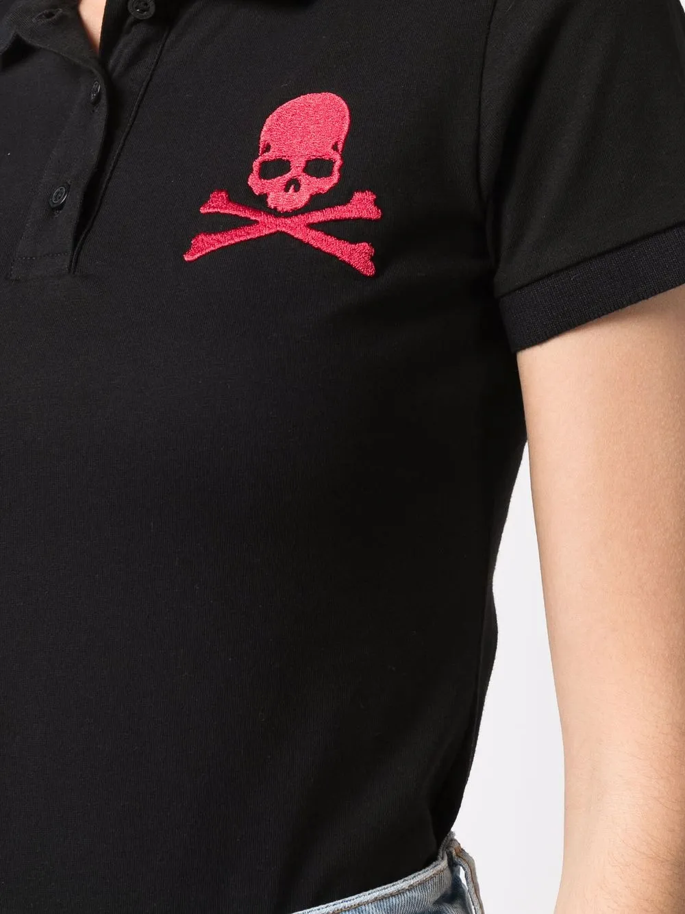 Нашивка в виде черепа, воротник поло, короткая застежка на пуговицах спереди, короткие рукава и прямой подол. Цвет: черный.