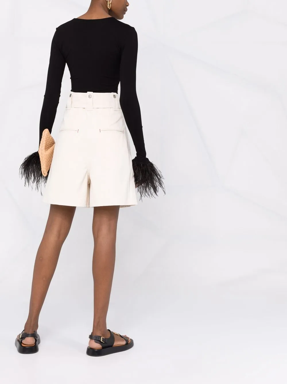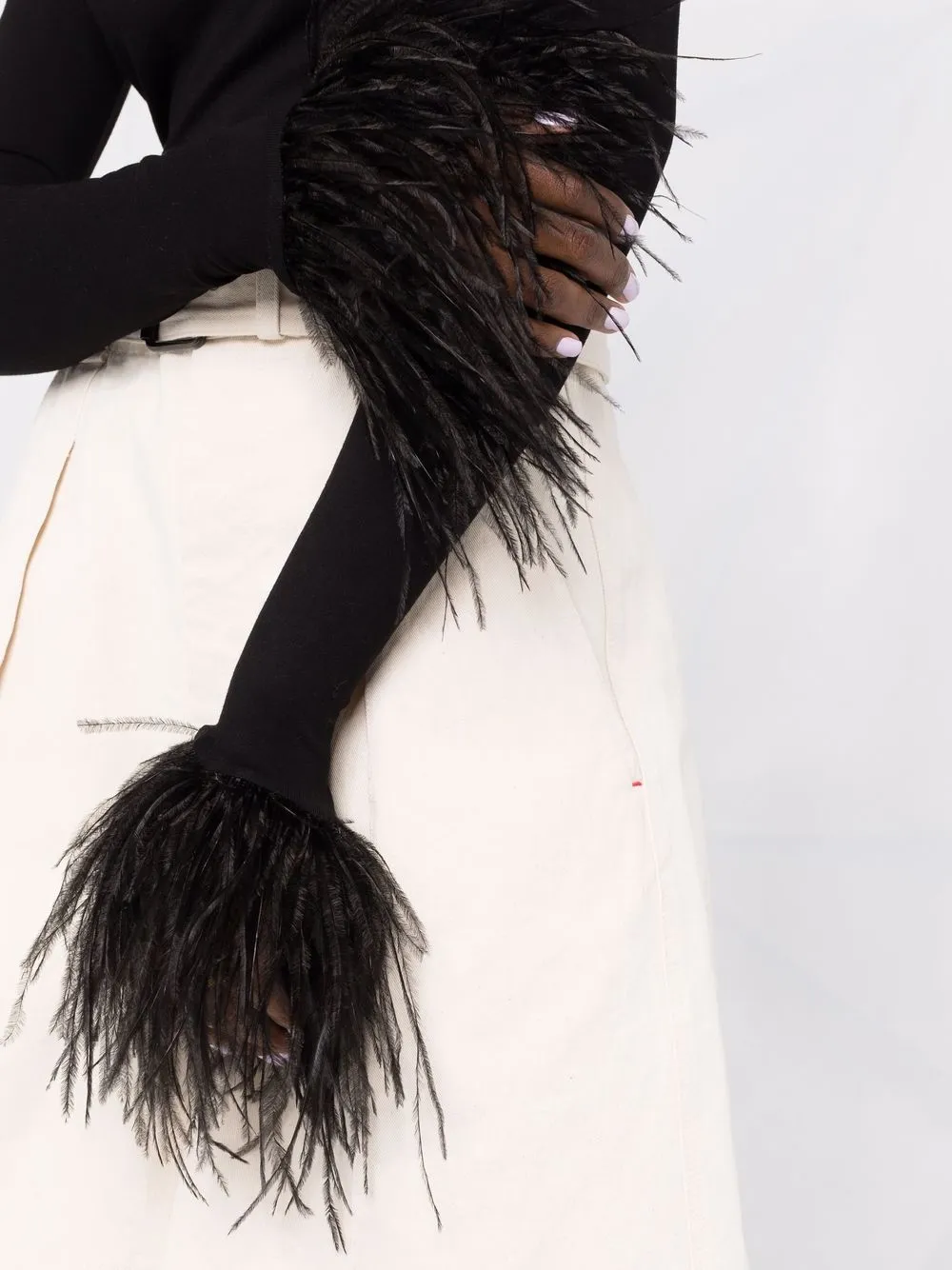 Отделка перьями, вырез-лодочка, длинные рукава, эластичная модель и прямой подол. Цвет: черный.