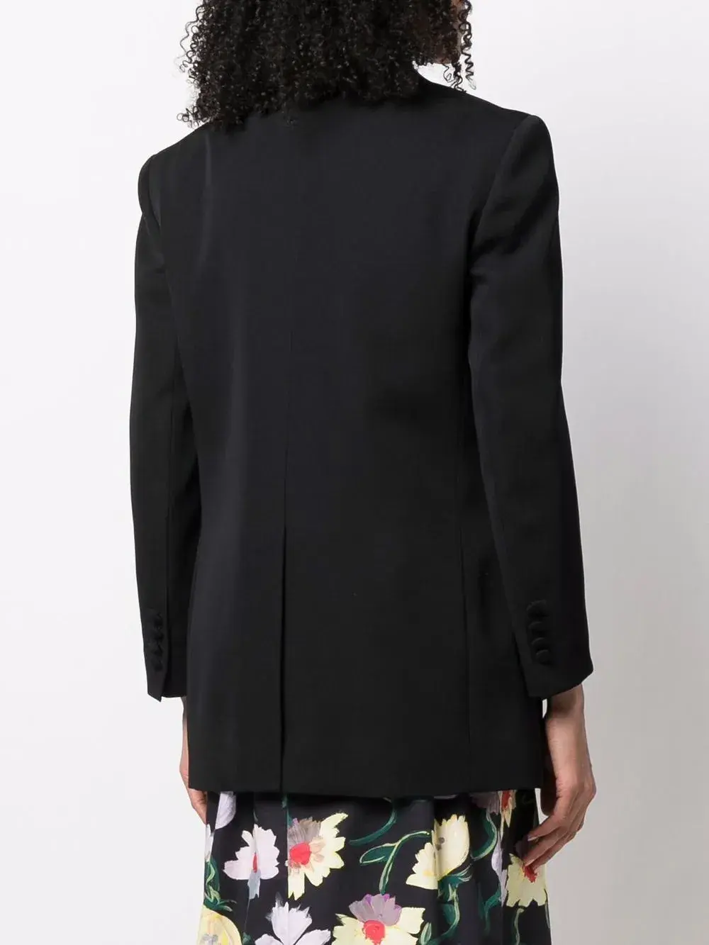 Узкий крой, классические лацканы, застежка на пуговицах спереди, длинные рукава и два передних кармана с клапанами. Цвет: черный.