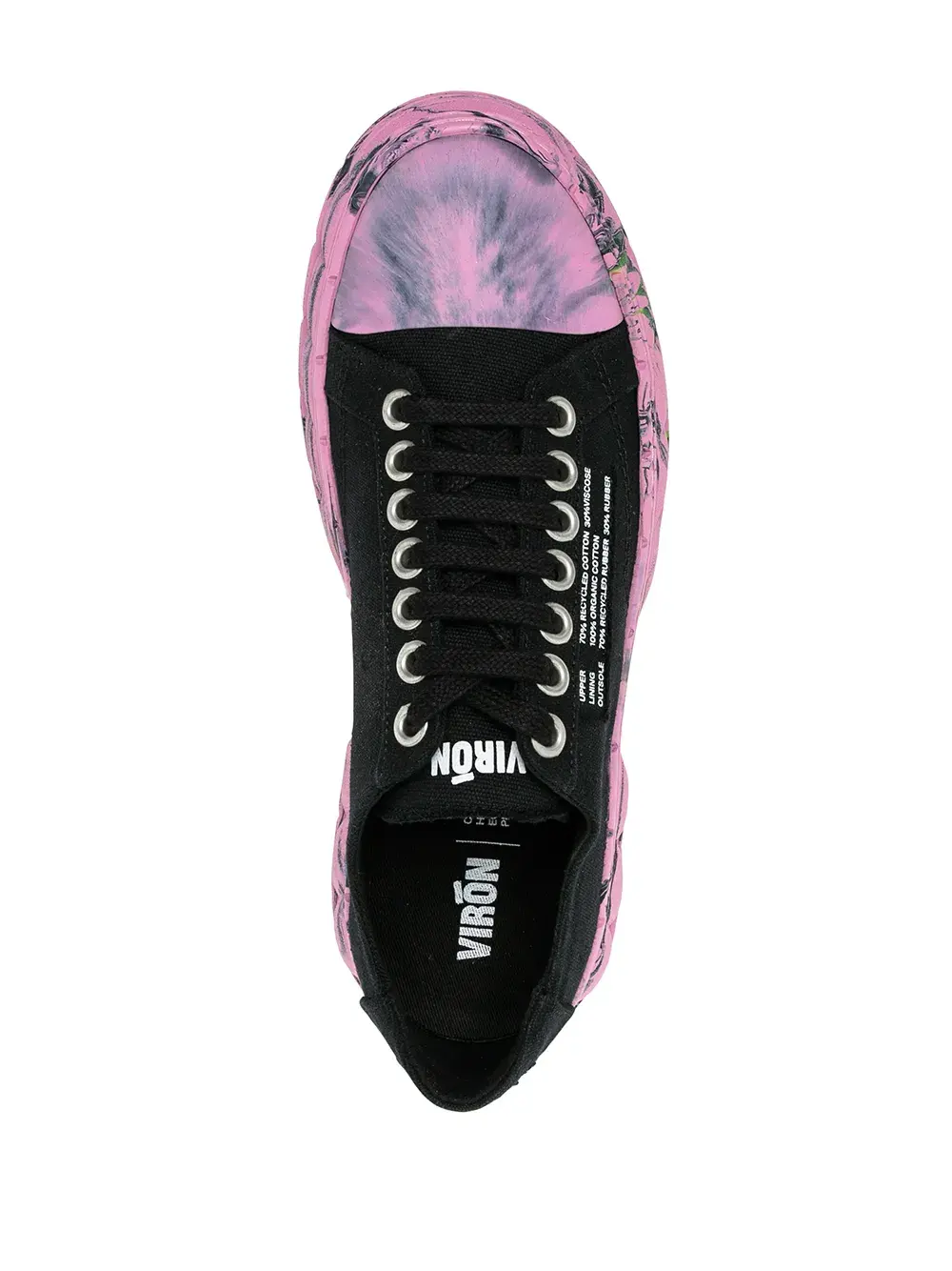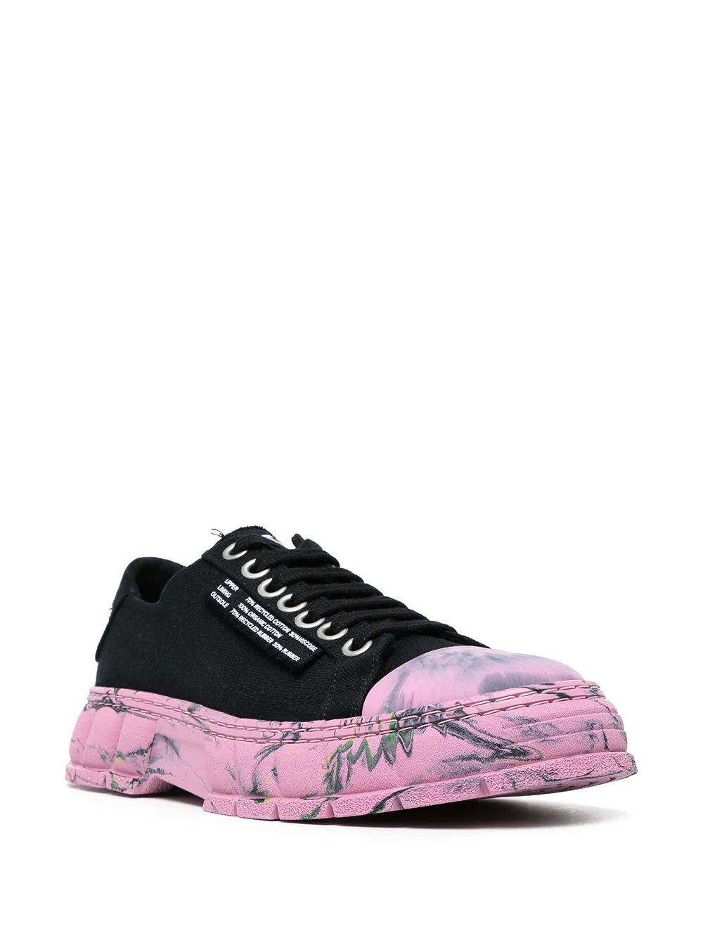 Мраморный узор, логотип сбоку, резиновый носок, шнуровка спереди и массивная резиновая подошва.