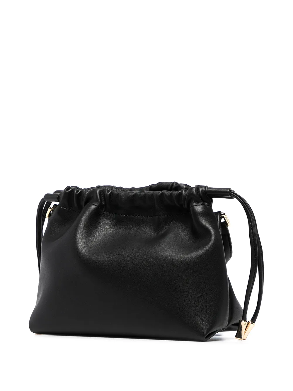 Золотистая фурнитура, золотистый логотип, застежка на шнурке и ремень на плечо.