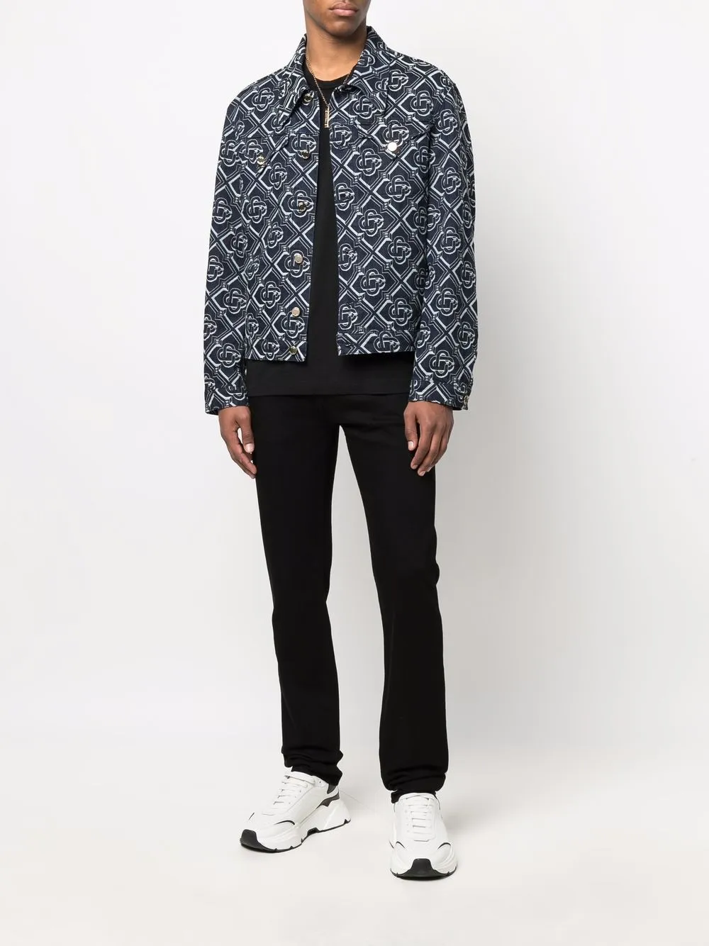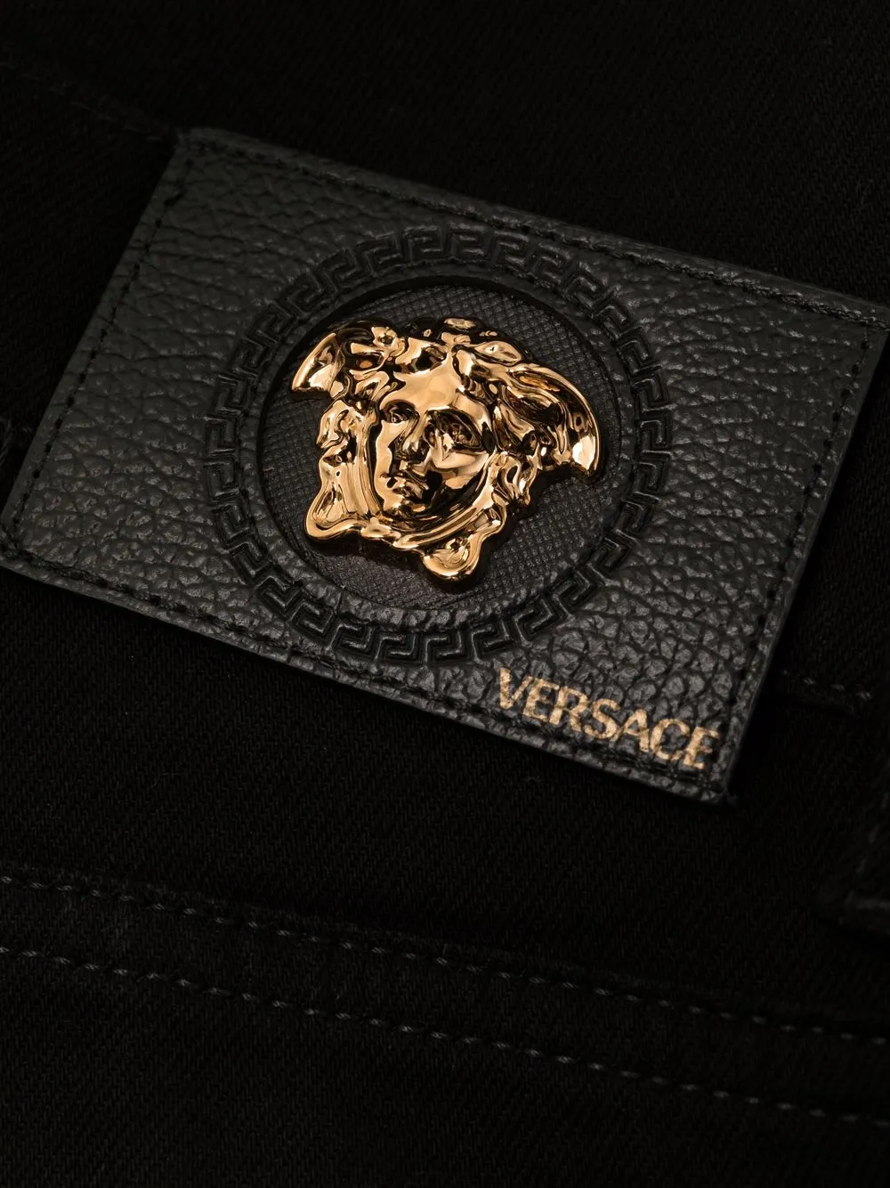 Золотистая фурнитура, узор Medusa Head, нашивка с логотипом сзади, петли для ремня, классическая пятикарманная модель, застежка на молнии и пуговице спереди, прямой крой и крой bootcut. Цвет: черный.