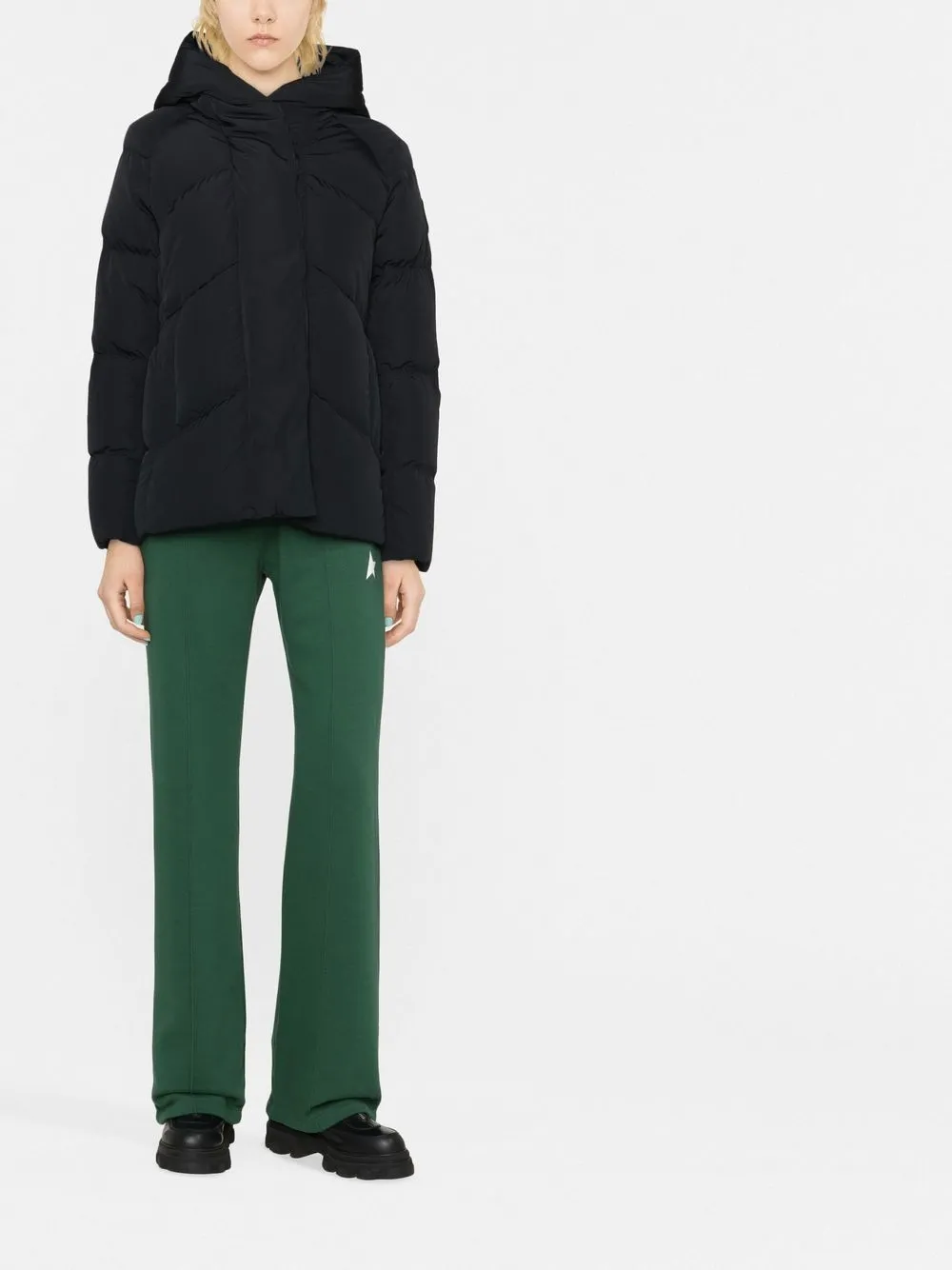 Черный, легкий материал, дутый материал, классический капюшон, застежка на молнии спереди, длинные рукава, прорезные карманы по бокам и прямой подол.