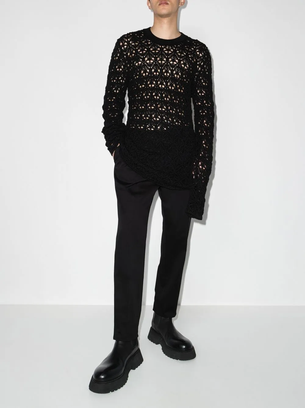 Укороченная длина, зауженный крой, застежка на молнии и пуговице спереди, средняя посадка, два прорезных кармана по бокам, карман с клапаном сбоку, два кармана с листочкой сзади и петли для ремня. Цвет: черный.
