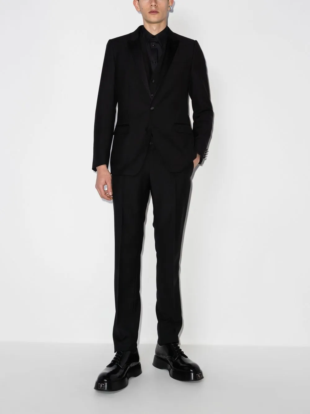 Строгий крой, заостренные лацканы, прорезной карман на груди, длинные рукава, манжеты на пуговицах, застежка на пуговицах спереди, передние карманы с клапаном, шлица по центру сзади, застежка на пуговицах спереди, без рукавов, два передних кармана с листочкой, петли для ремня, потайная застежка спереди, два прорезных кармана по бокам, два кармана с листочкой сзади и стрелки. Цвет: черный.
