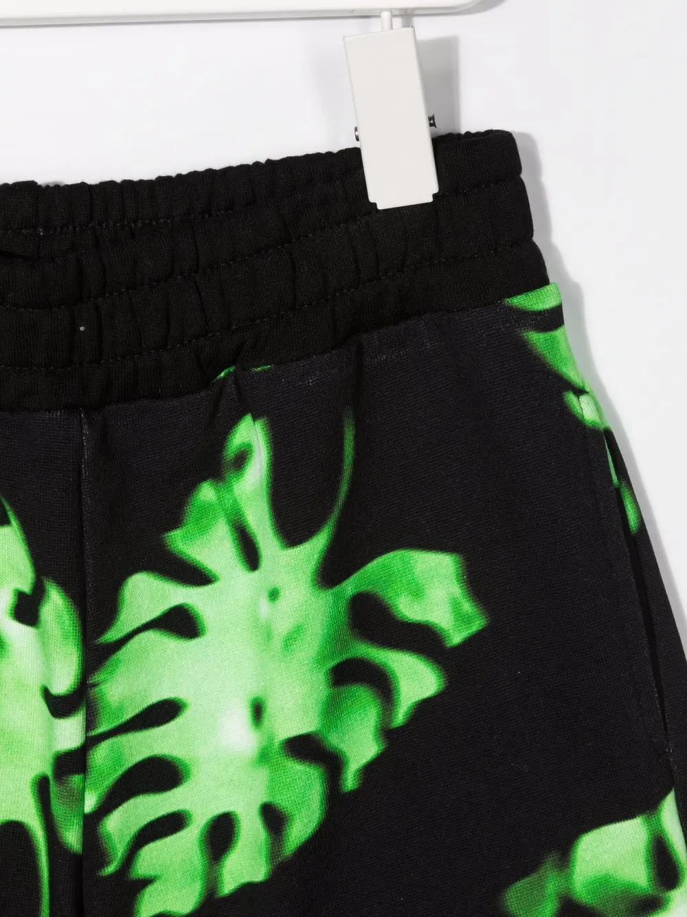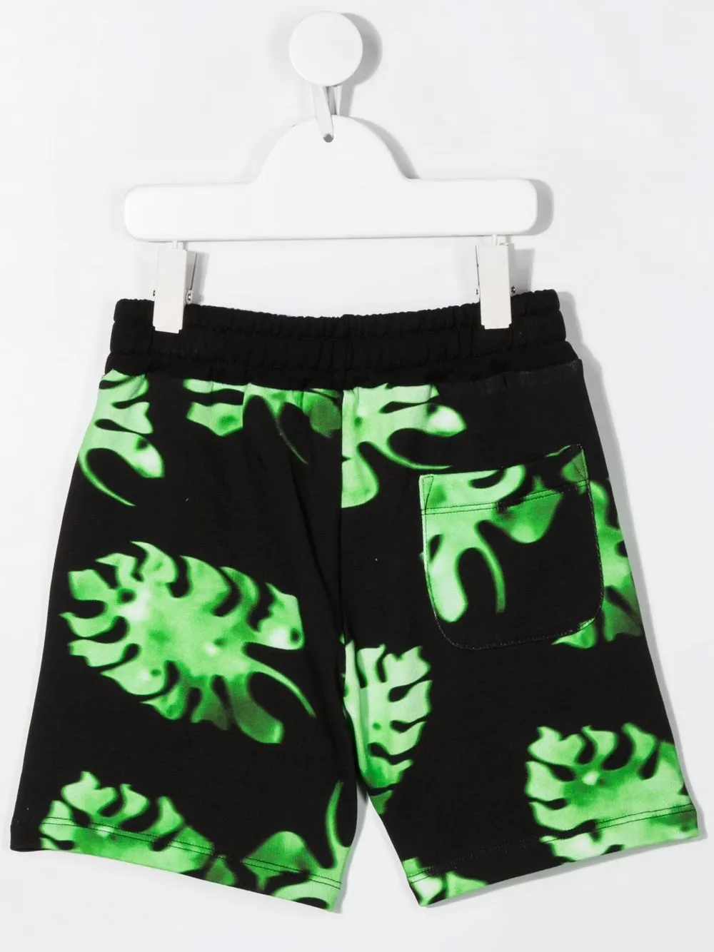 Принт с изображением листьев, логотип спереди, эластичный пояс на шнурке, накладной карман сзади, расклешенный крой и длина до бедер. Цвет: черный.