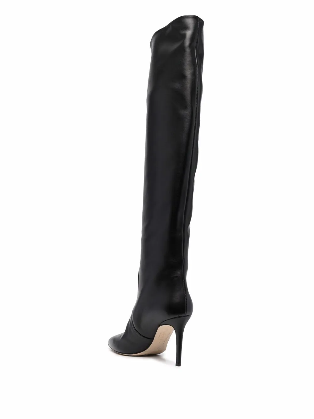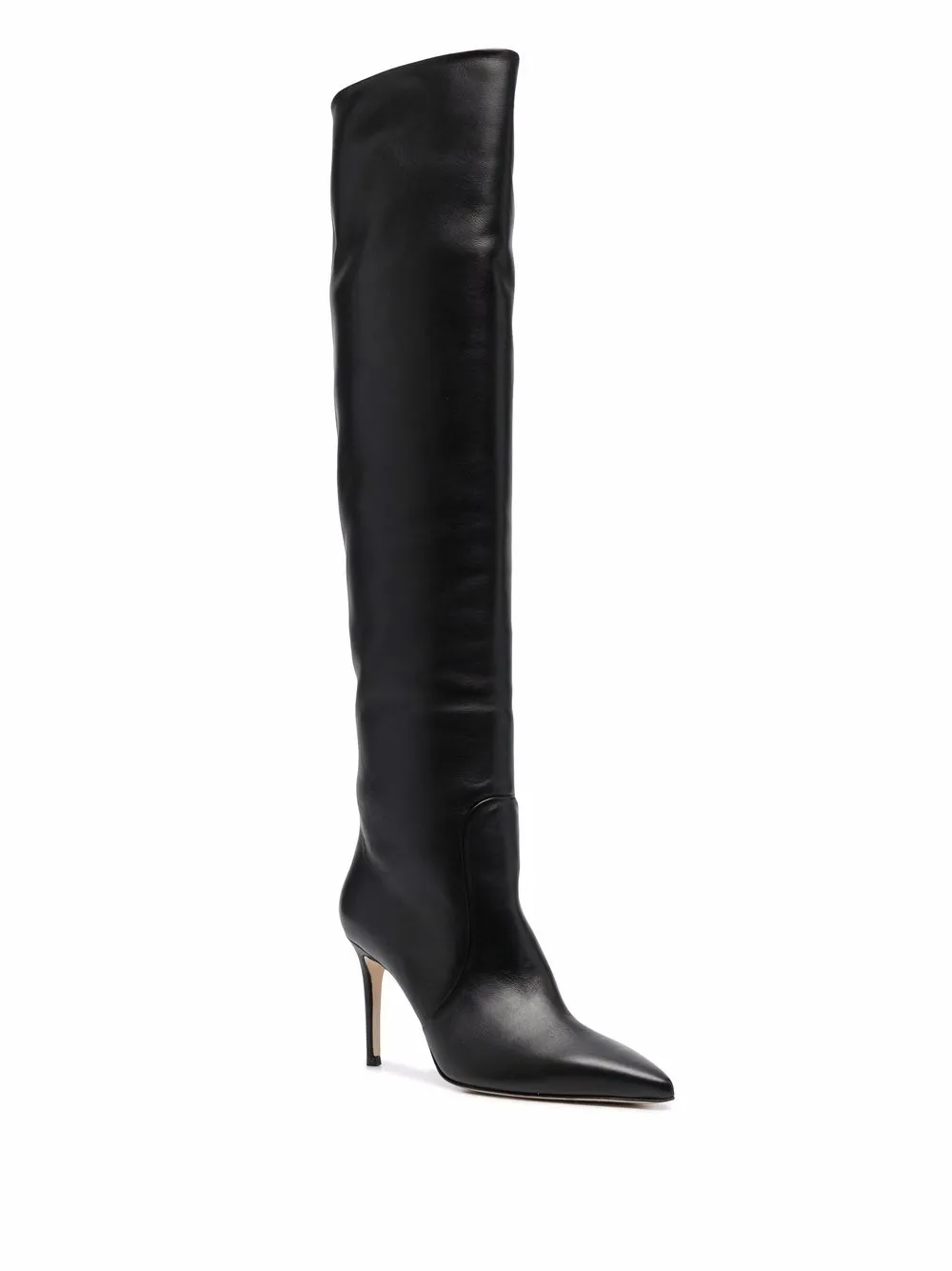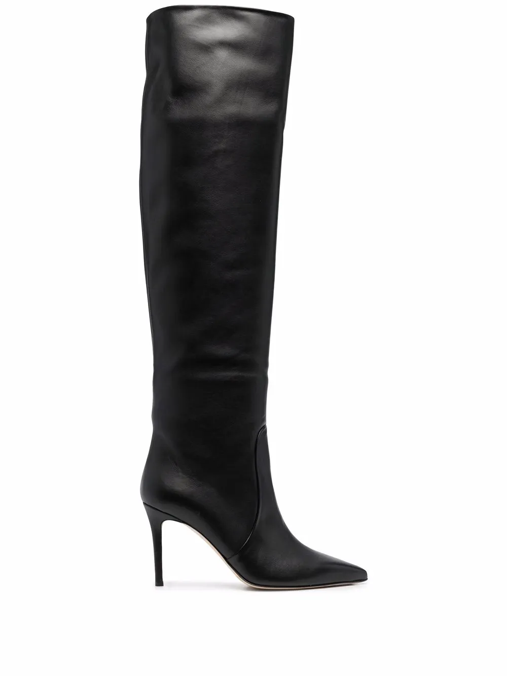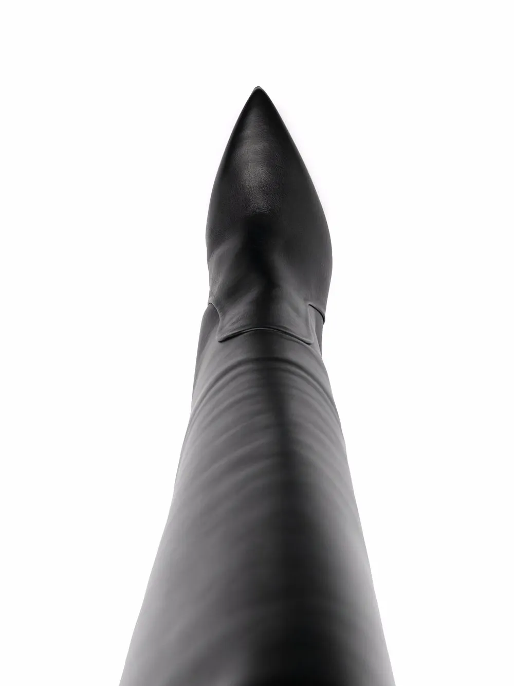 Заостренный носок, модель без застежки, длина по колено, каблук на высокой шпильке и кожаная подошва. Цвет: черный.