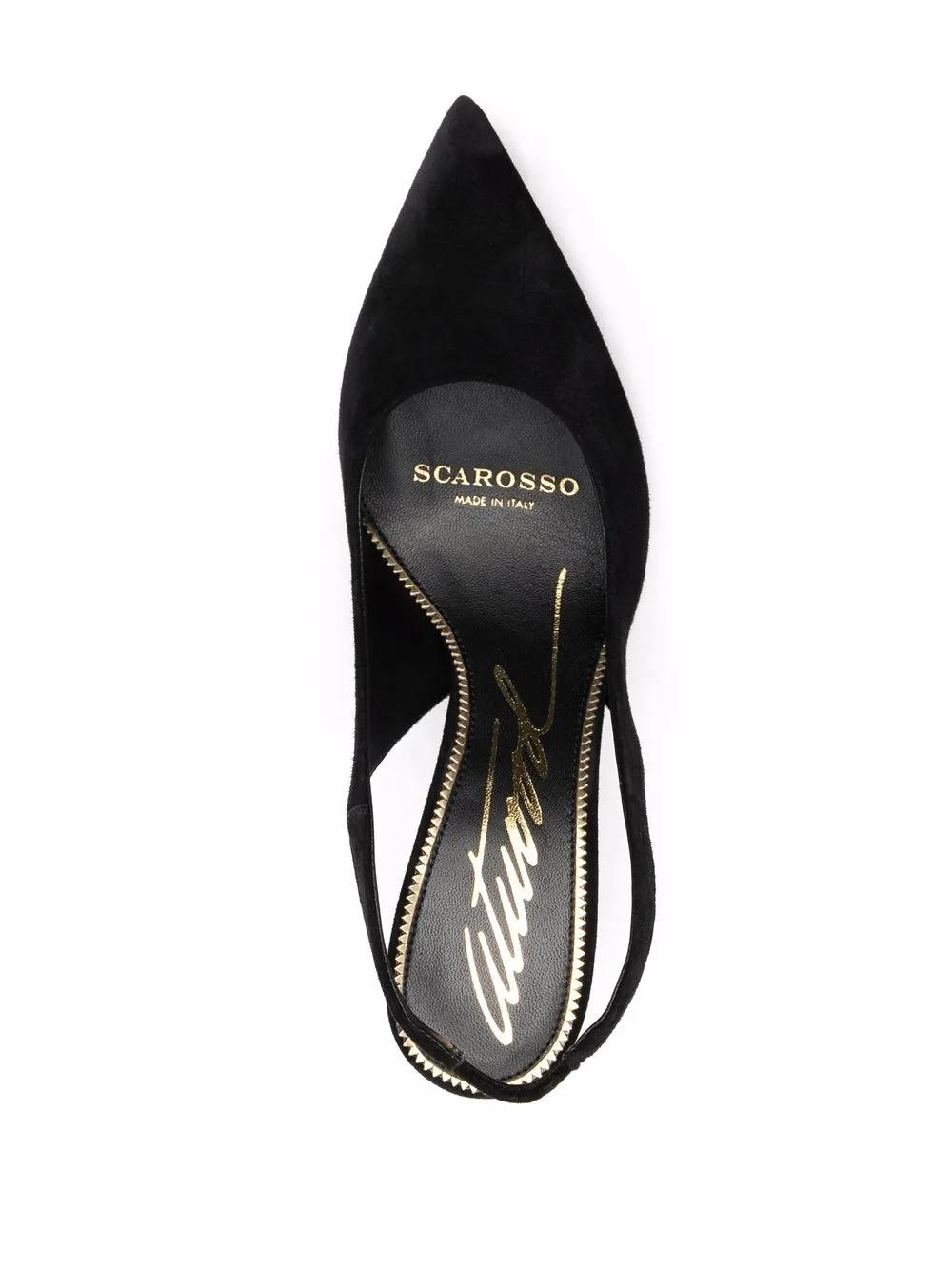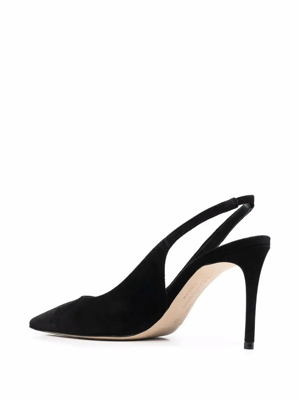 Заостренный носок, модель без застежки, ремешок на пятке, стелька с логотипом и кожаная подошва. Цвет: черный.