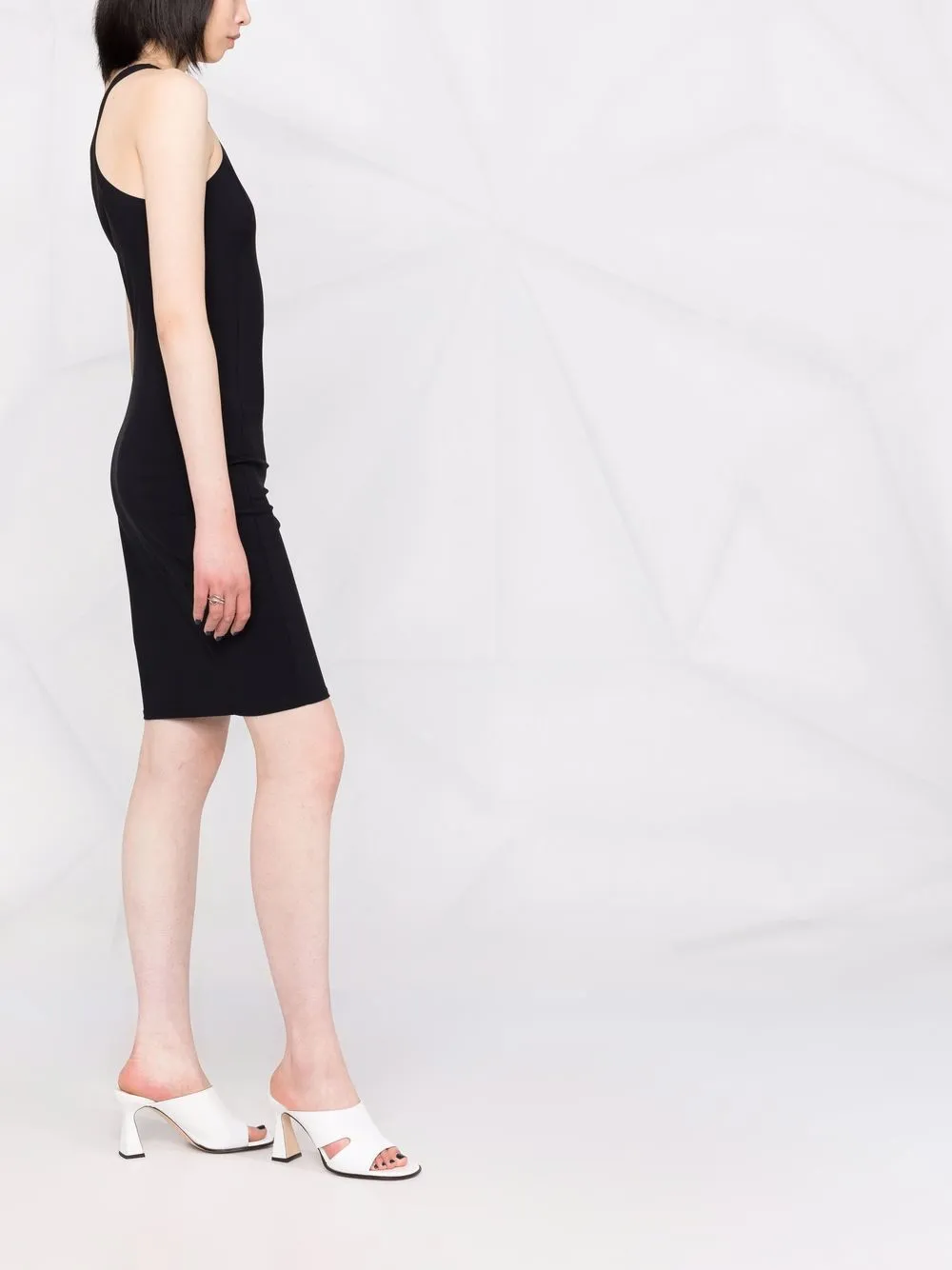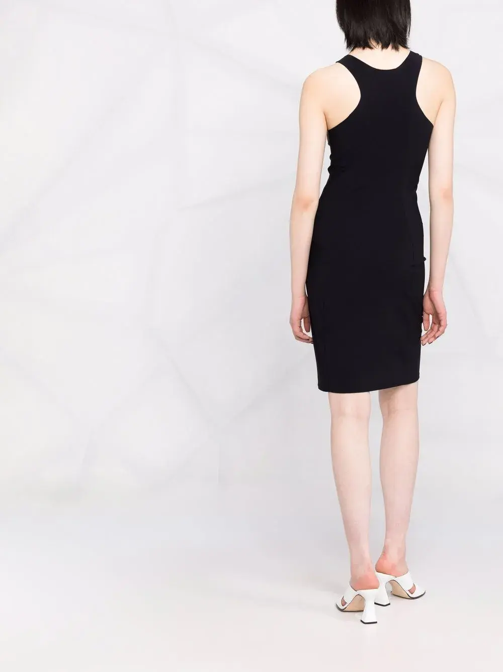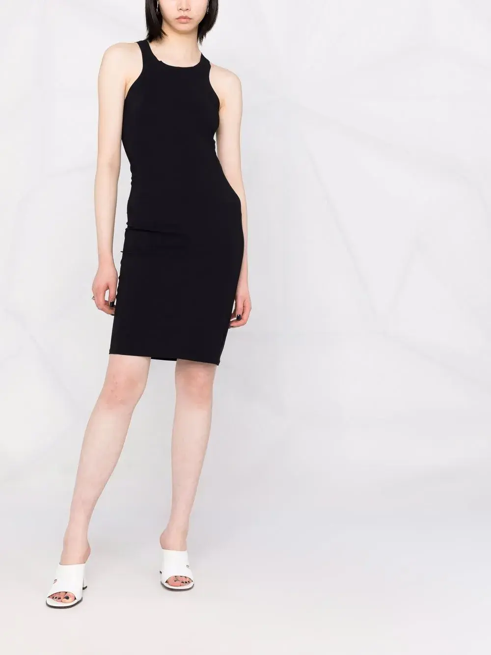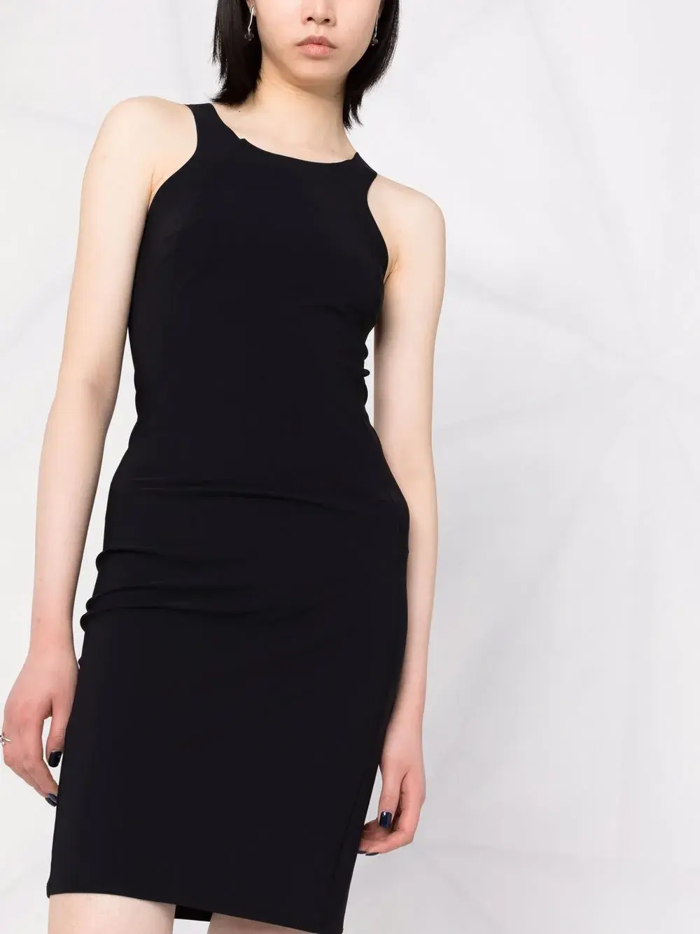 Круглый вырез, без рукавов, вырез рейсер, эластичная модель, прямой подол и длина выше колена. Цвет: черный.