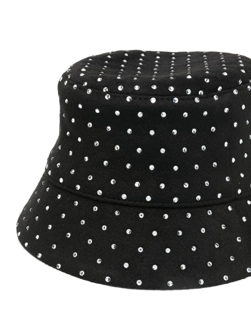 Черный, хлопок, декор из кристаллов, плоская тулья и узкие опущенные поля.