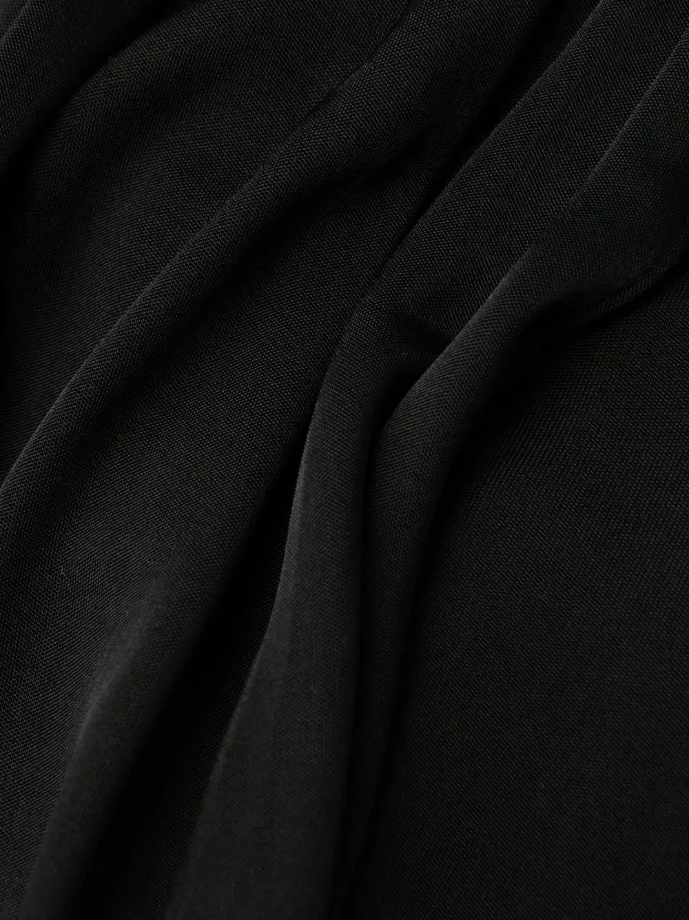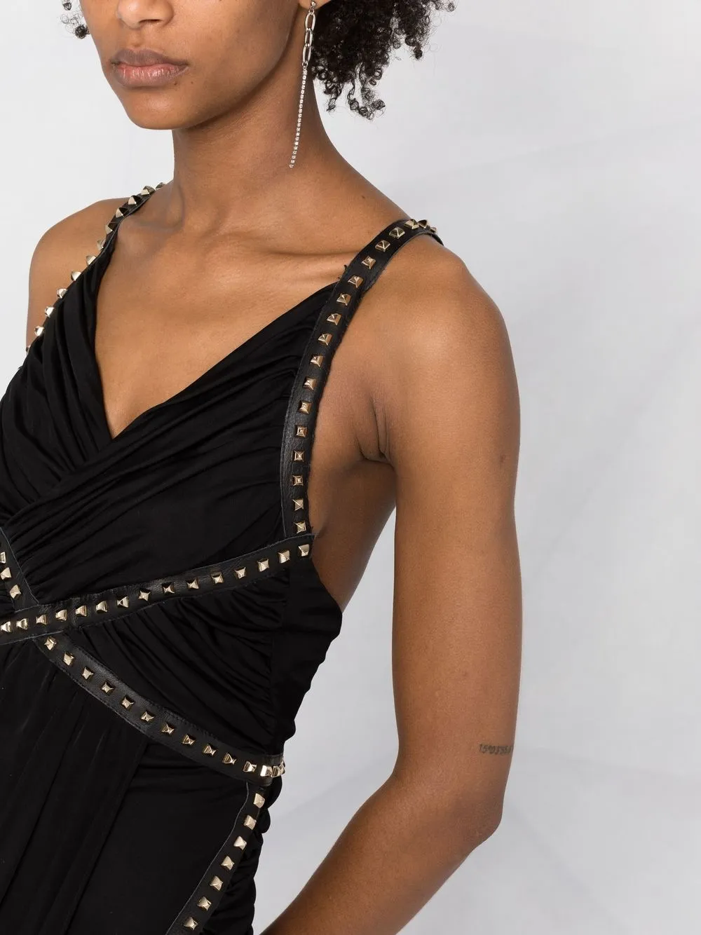 Черный, золотистый металлический логотип, золотистые заклепки, тонкие бретели, V-образный вырез, детали с оборками, драпированная юбка, низкий вырез на спине и длина макси.