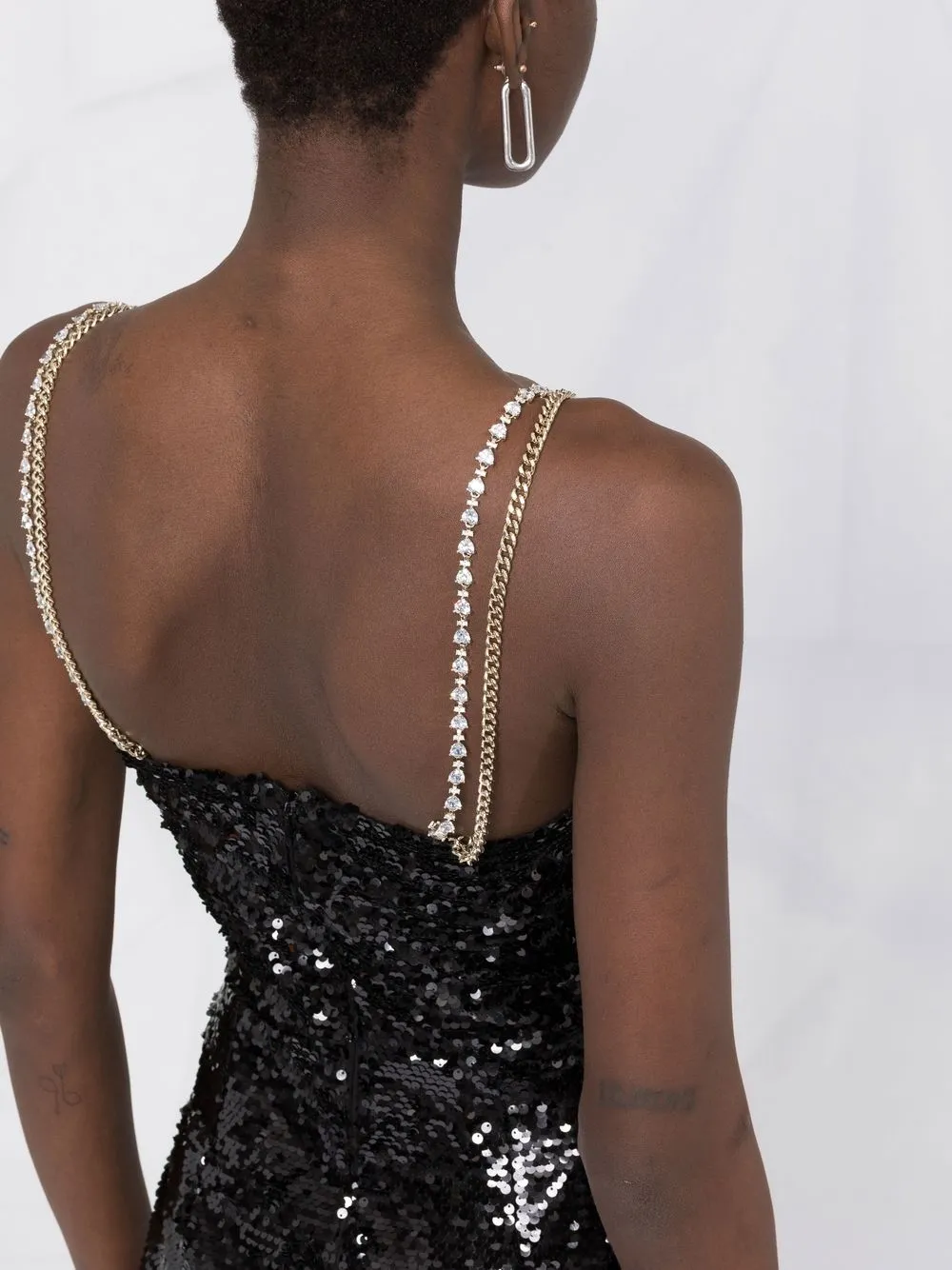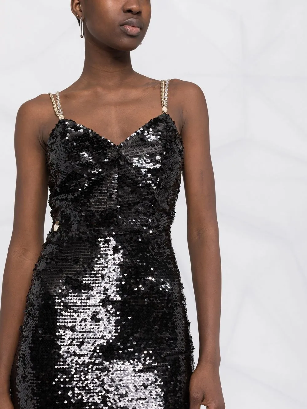 Черный, украшение из пайеток, декор из кристаллов, тонкие бретели, V-образный вырез, застежка на молнии сзади и длина по колено.