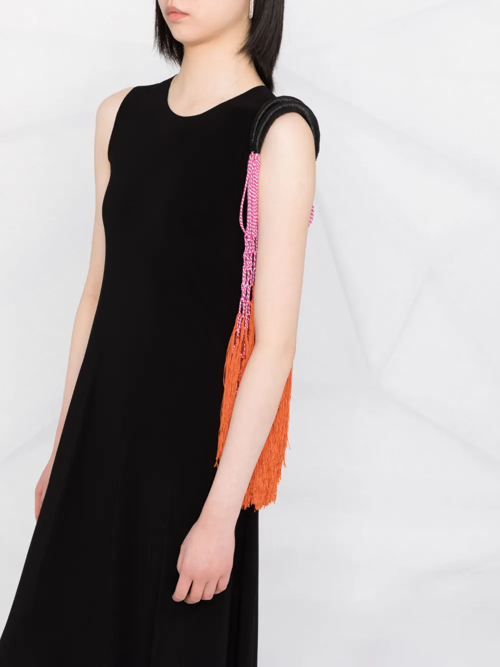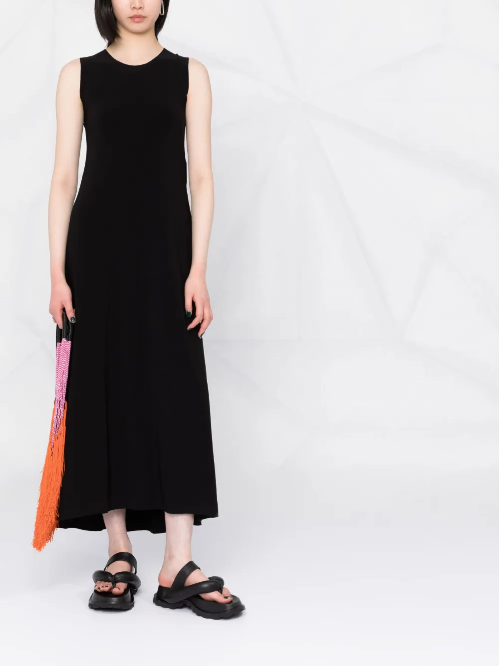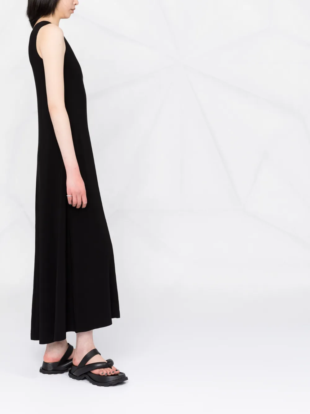 Бархатный эффект, без рукавов, круглый вырез, расклешенный крой и длина по щиколотку. Цвет: черный.