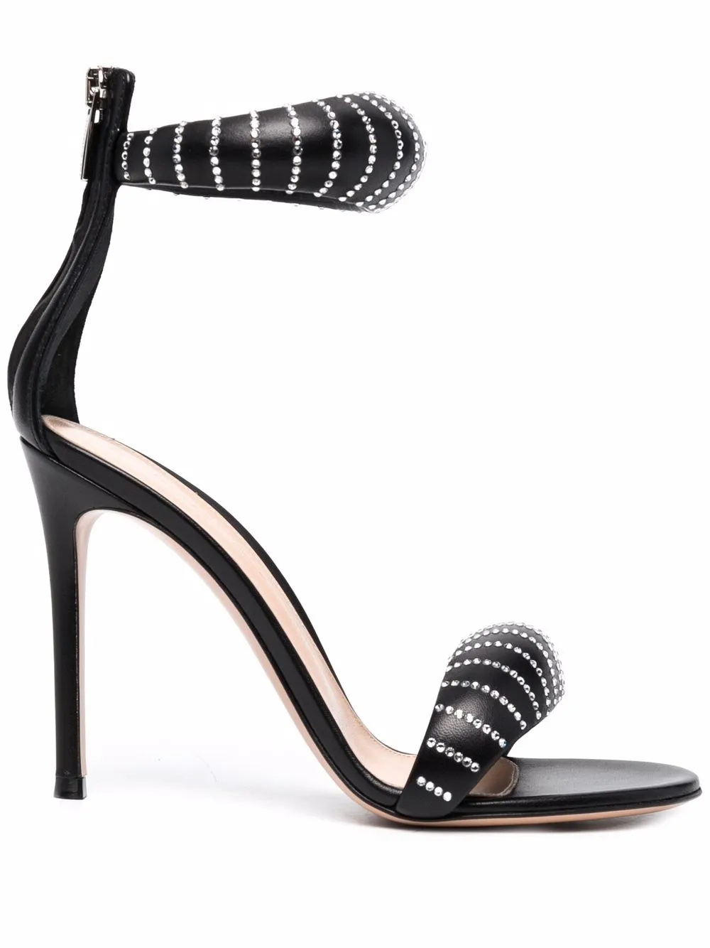 Кожаная подкладка, декор из кристаллов, браслет в два оборота, открытый носок, застежка на молнии сзади и высокий каблук.