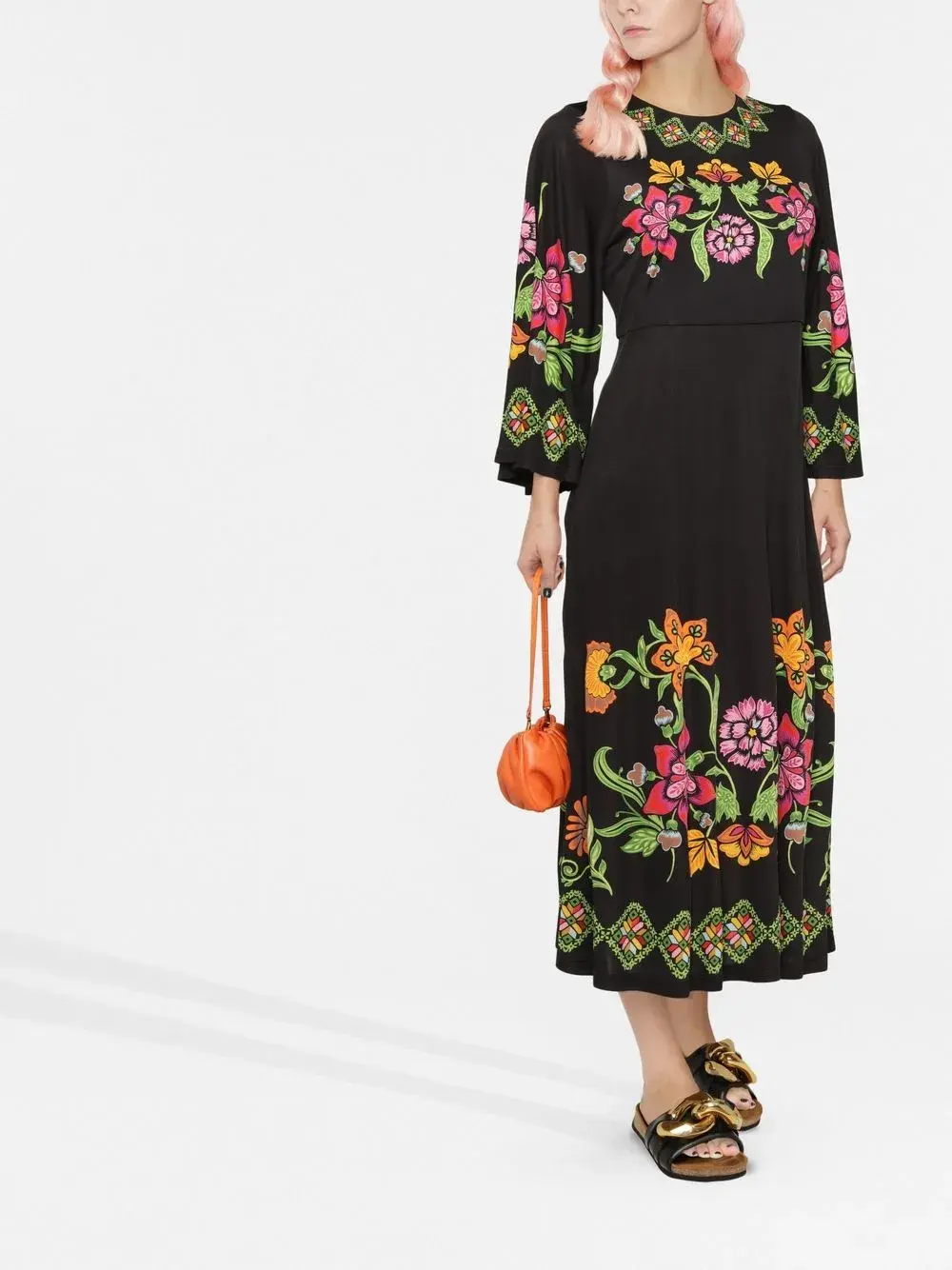 Черный, эластичный материал, цветочный принт, круглый вырез, вырез сзади, длинные рукава и длина до середины голени.