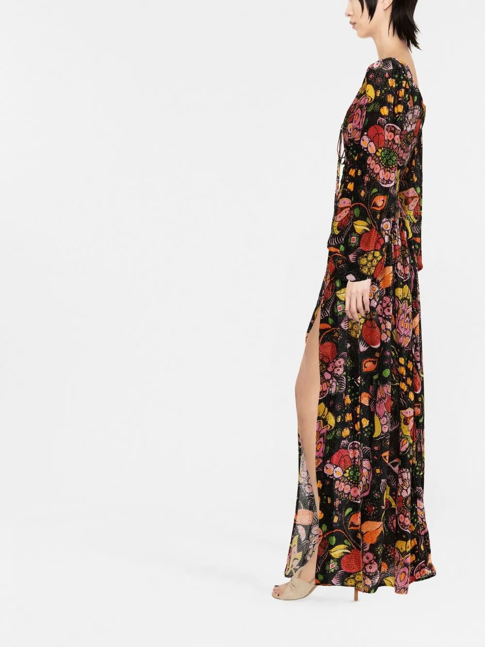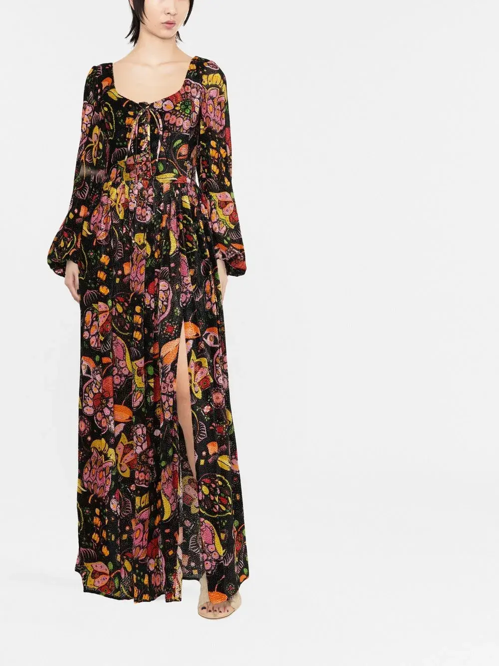 Сплошной графичный принт, U-образный вырез, разрез спереди и длинные рукава.