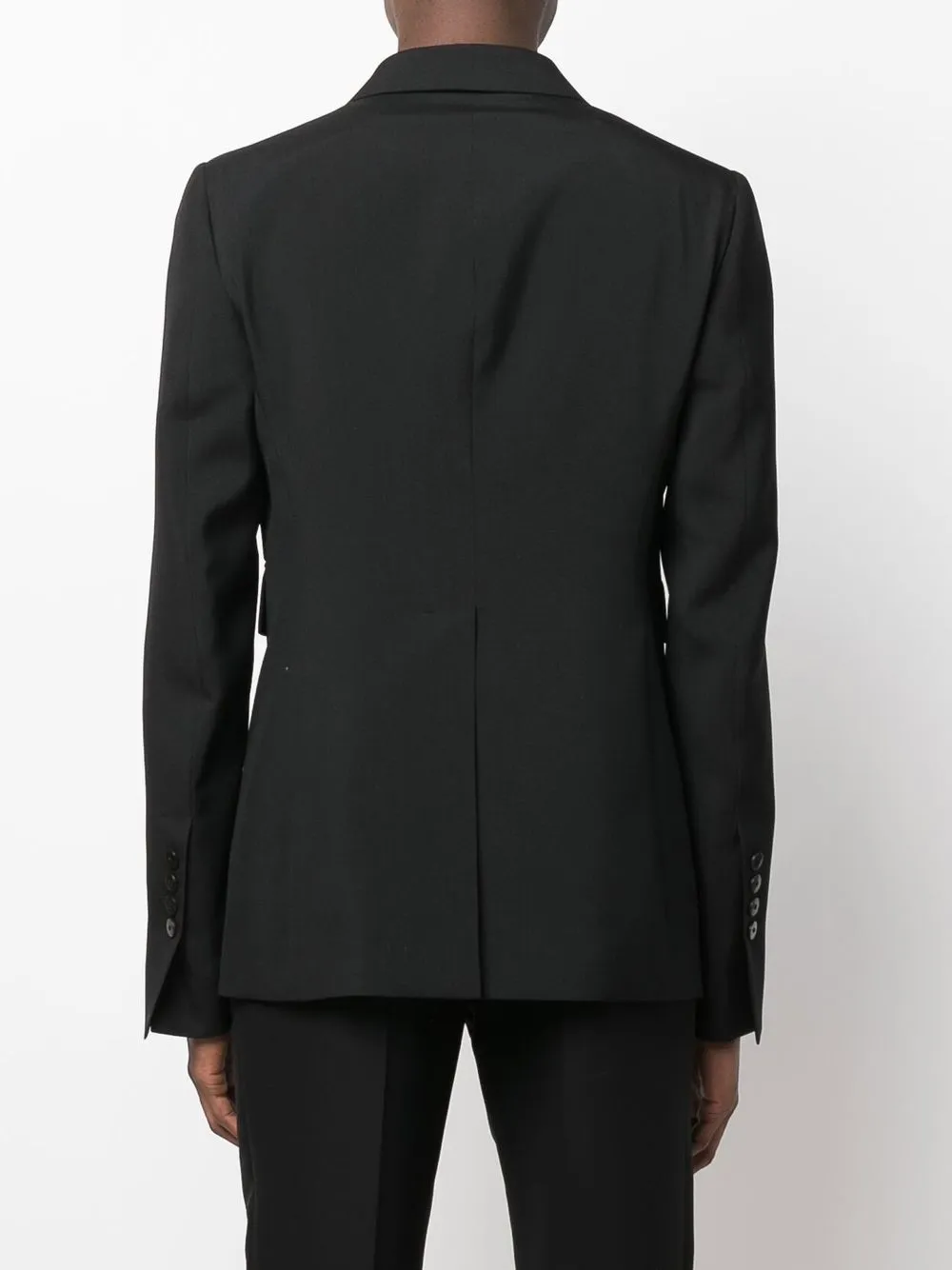 Черный, смесь хлопка и шерсти, двубортная застежка на кнопки, длинные рукава, два кармана с клапанами по бокам и строгий крой.