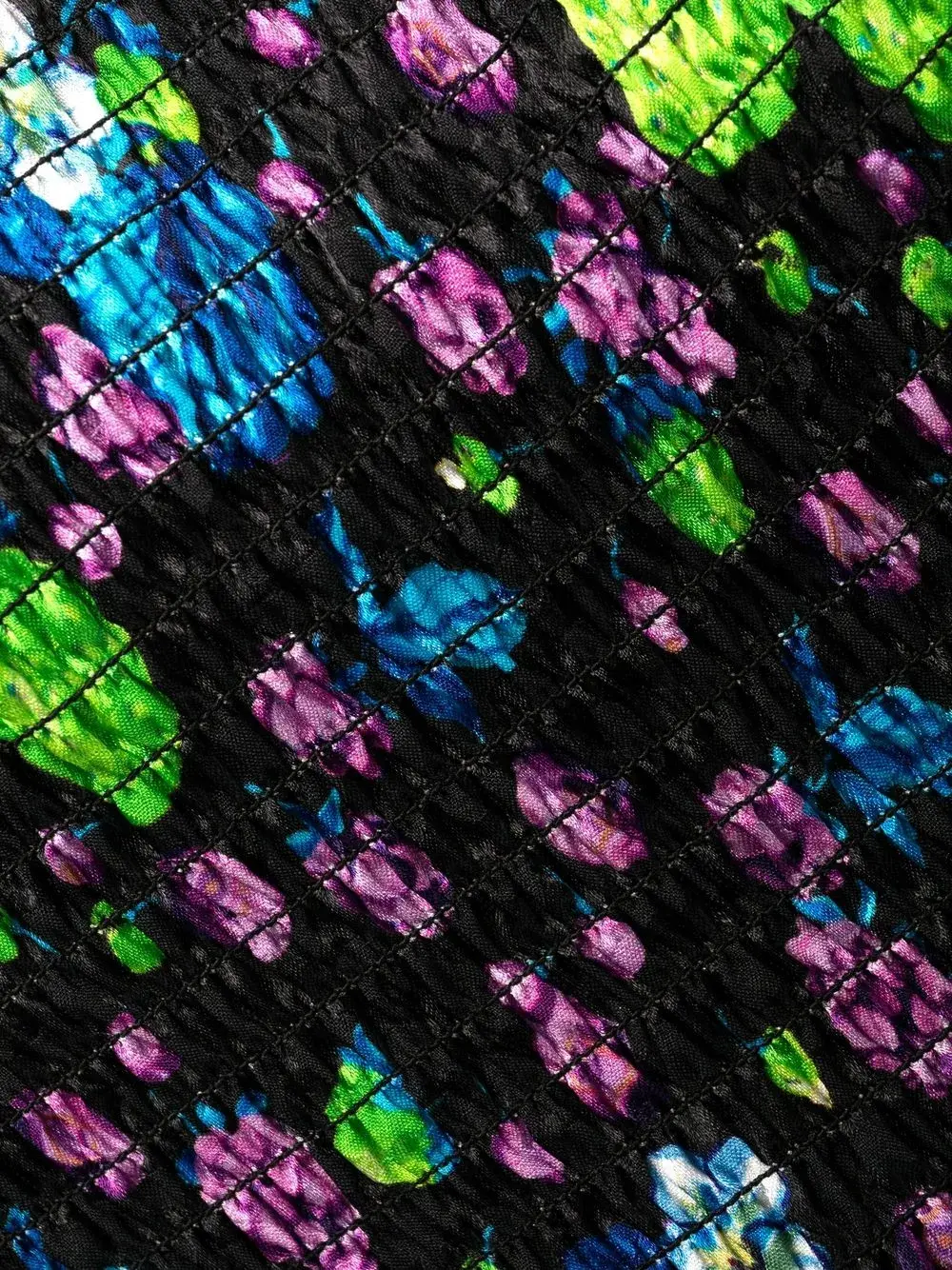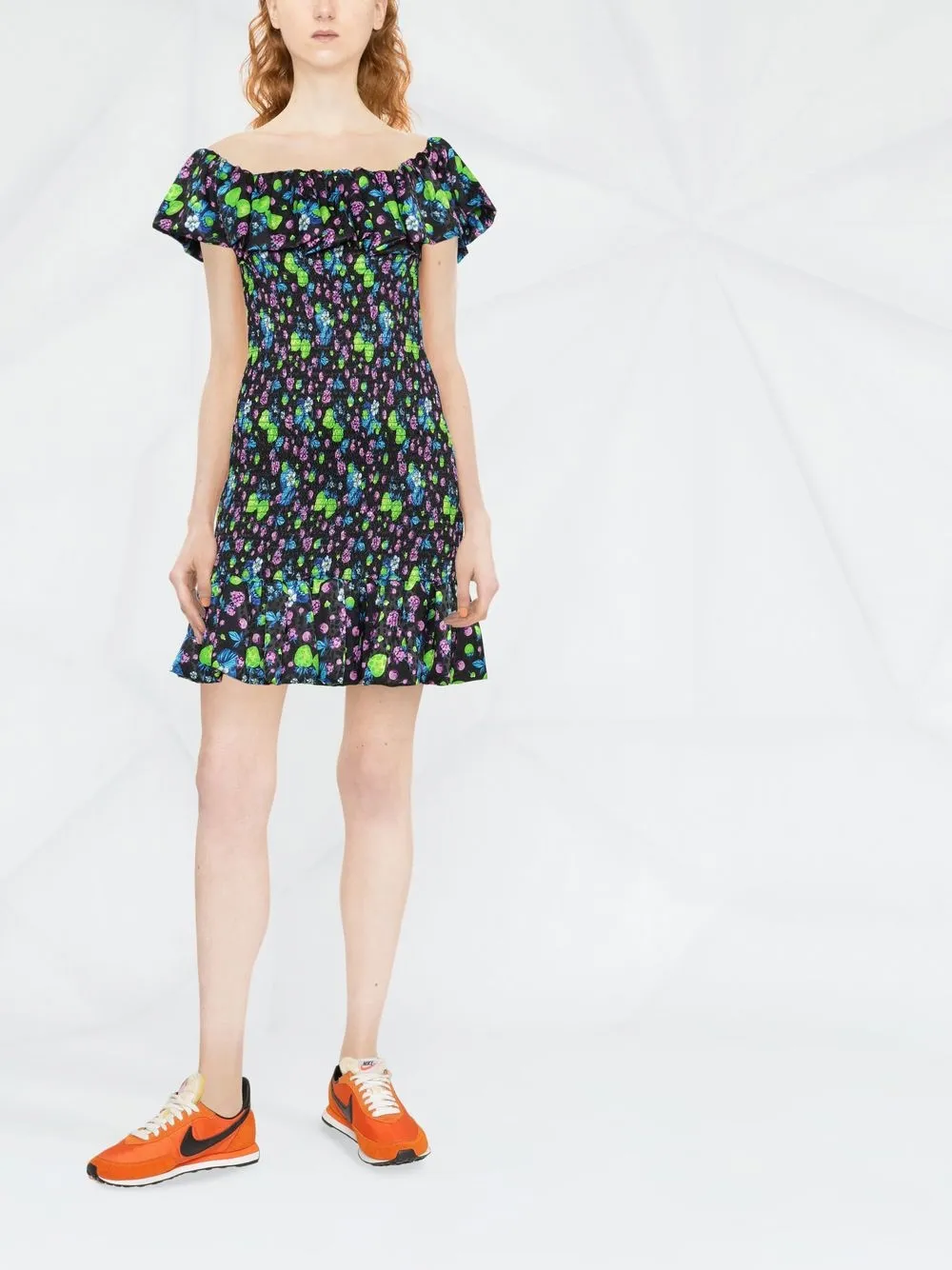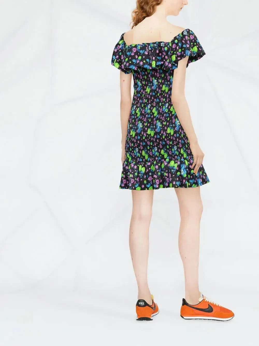 Черный, разноцветный, расклешенный крой, сплошной графичный принт, вставка со сборками, квадратный вырез, короткие рукава и подол с оборками.