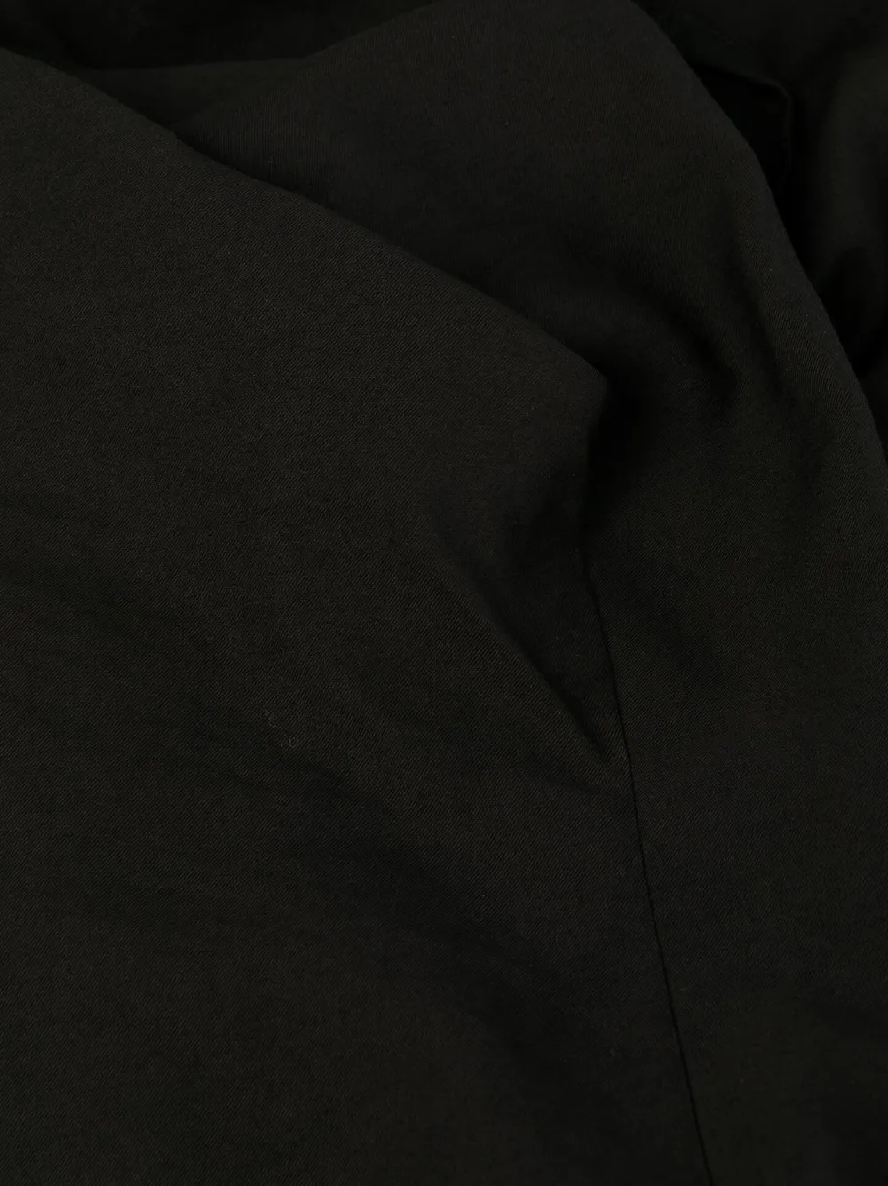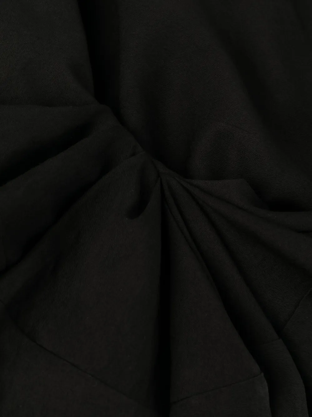 Черный, детали с оборками, воротник-хомут, регулируемые тонкие бретели, открытая спина, боковой разрез, асимметричный подол и потайная застежка на молнии сбоку.