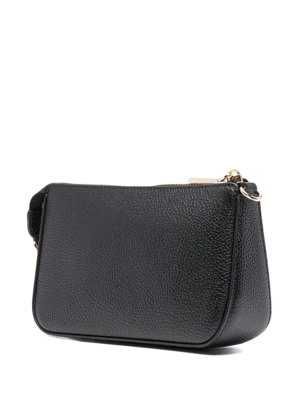 Черный, кожа, золотистая фурнитура, логотип, застежка на молнии сверху, ремешок-цепочка на плечо и внутренние накладные карманы.
