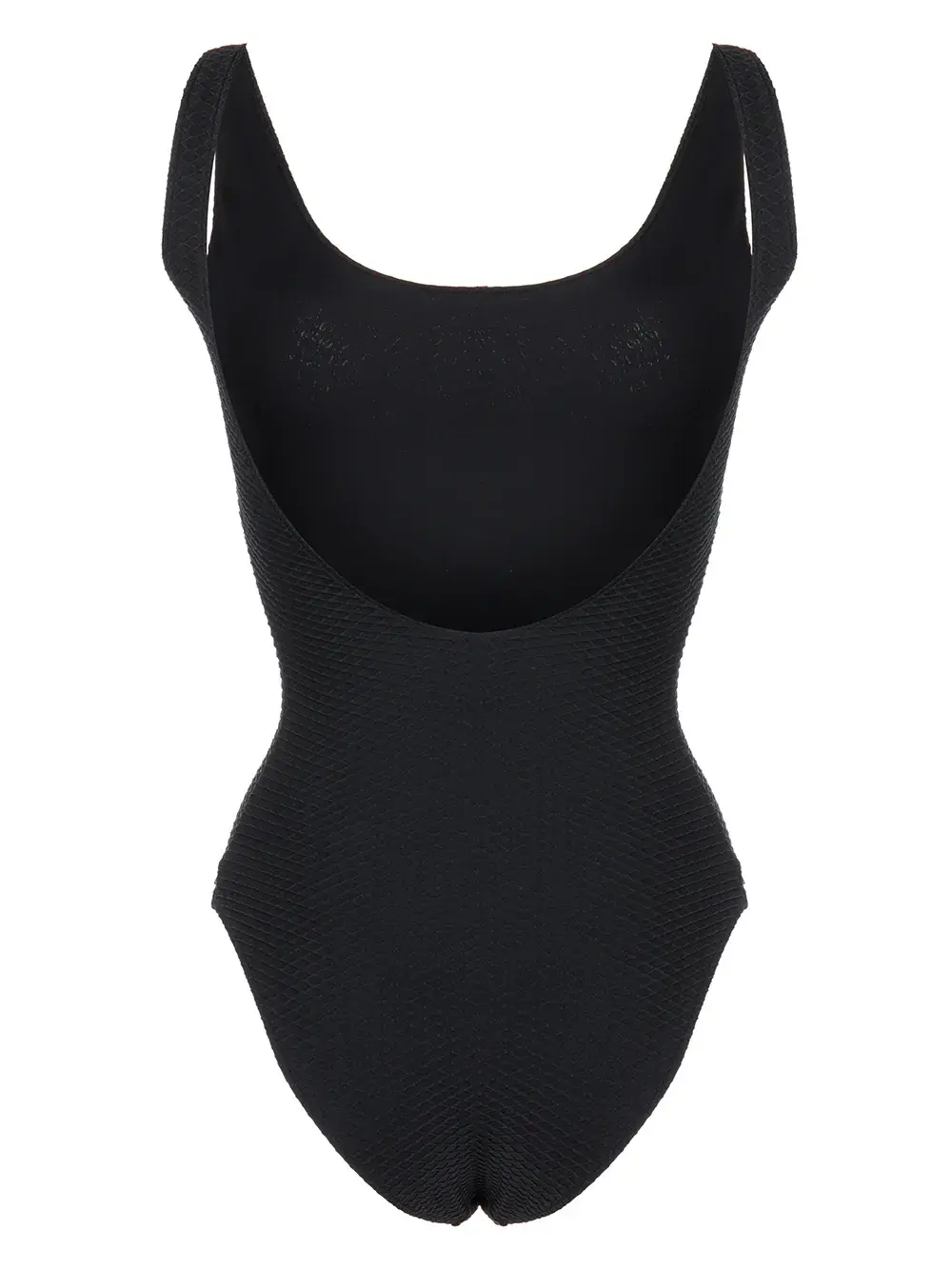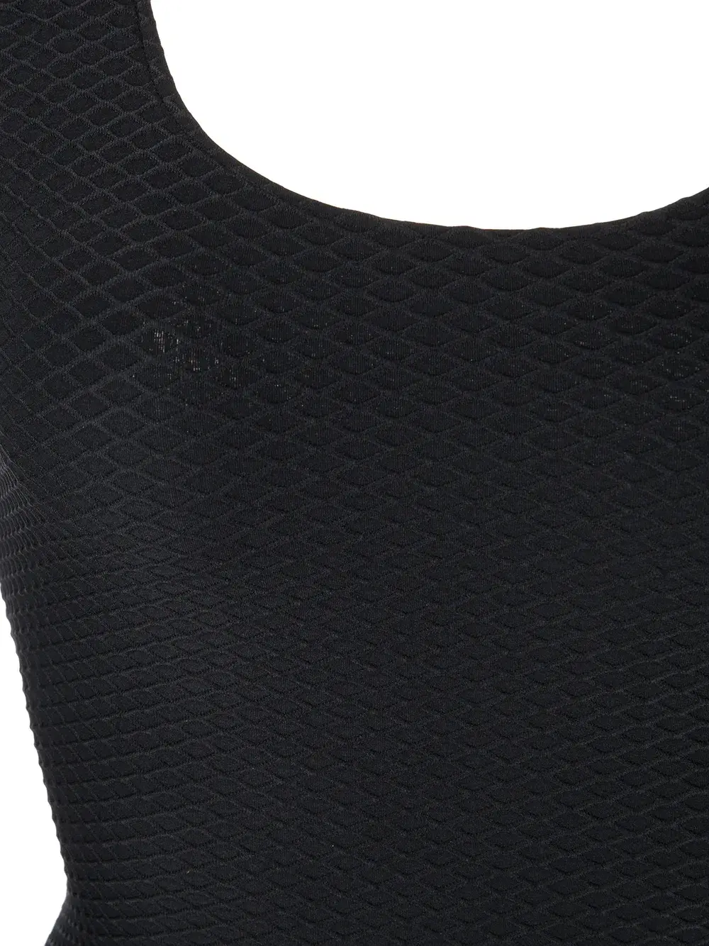 Черный, фактурная отделка, эластичный материал, U-образный вырез и U-образный вырез на спине.