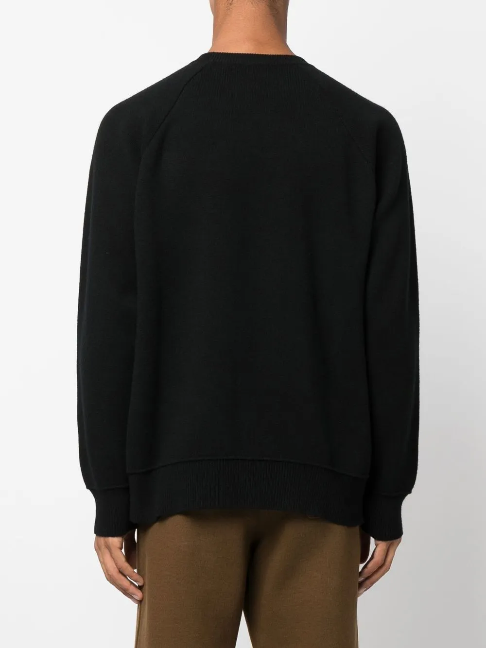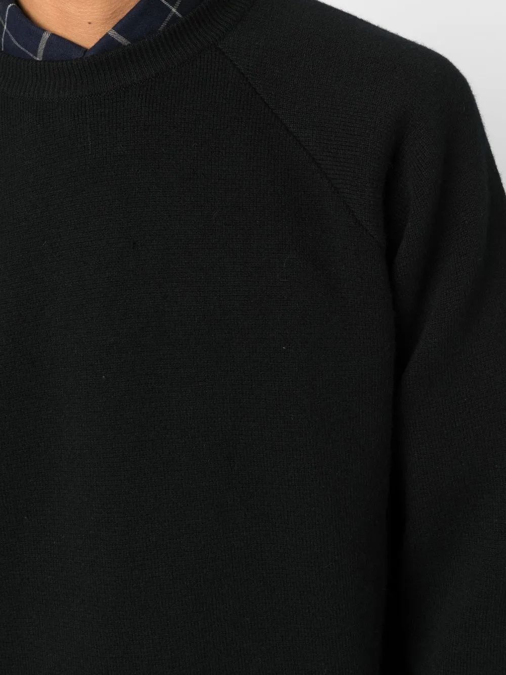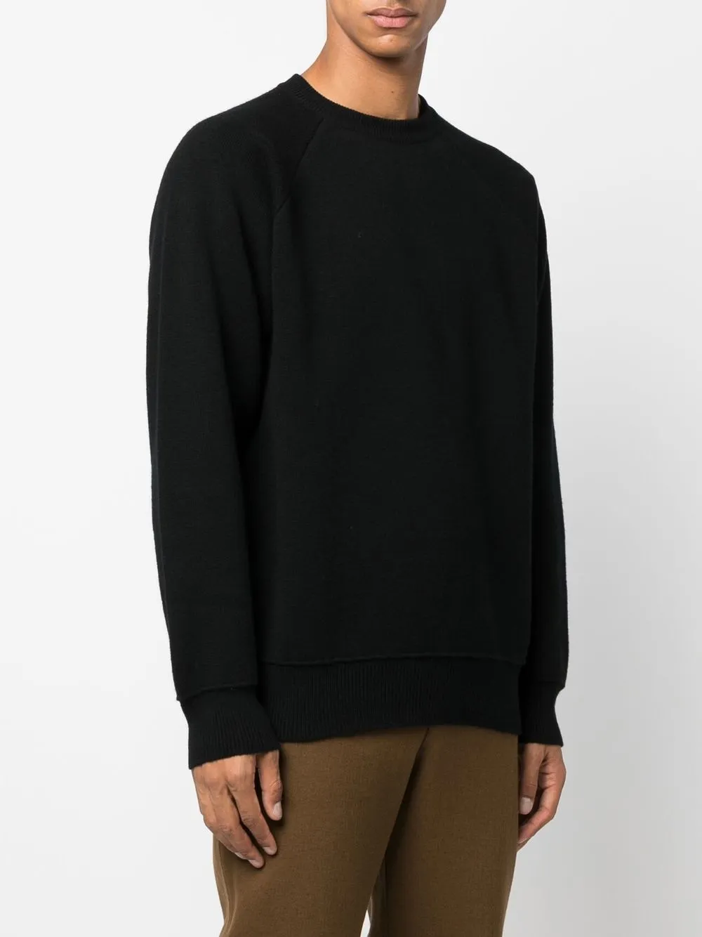 Черный, смесь хлопка и кашемира, трикотажный материал, отделка в рубчик, круглый вырез, длинные рукава и прямой подол.